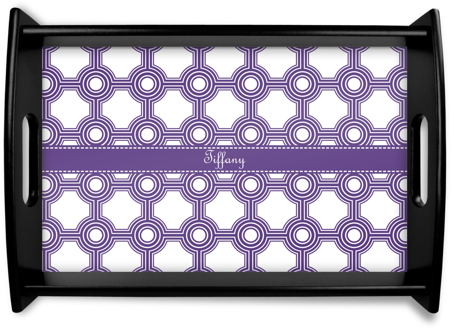 This serving tray with handles features square edges and two rounded sides, creating a very modern look. Each side is fabricated from a beautifully cut, natural wood. The bottom of the interior of the tray displays your customized design in bright, vibrant color. The tray is sold in both a black color and a natural wood look. Each variation of the wood serving tray has two sizes: Small, which is 14" x 10" x 2.25", and Large, which is 19.5" x 13.5" x 2.75".