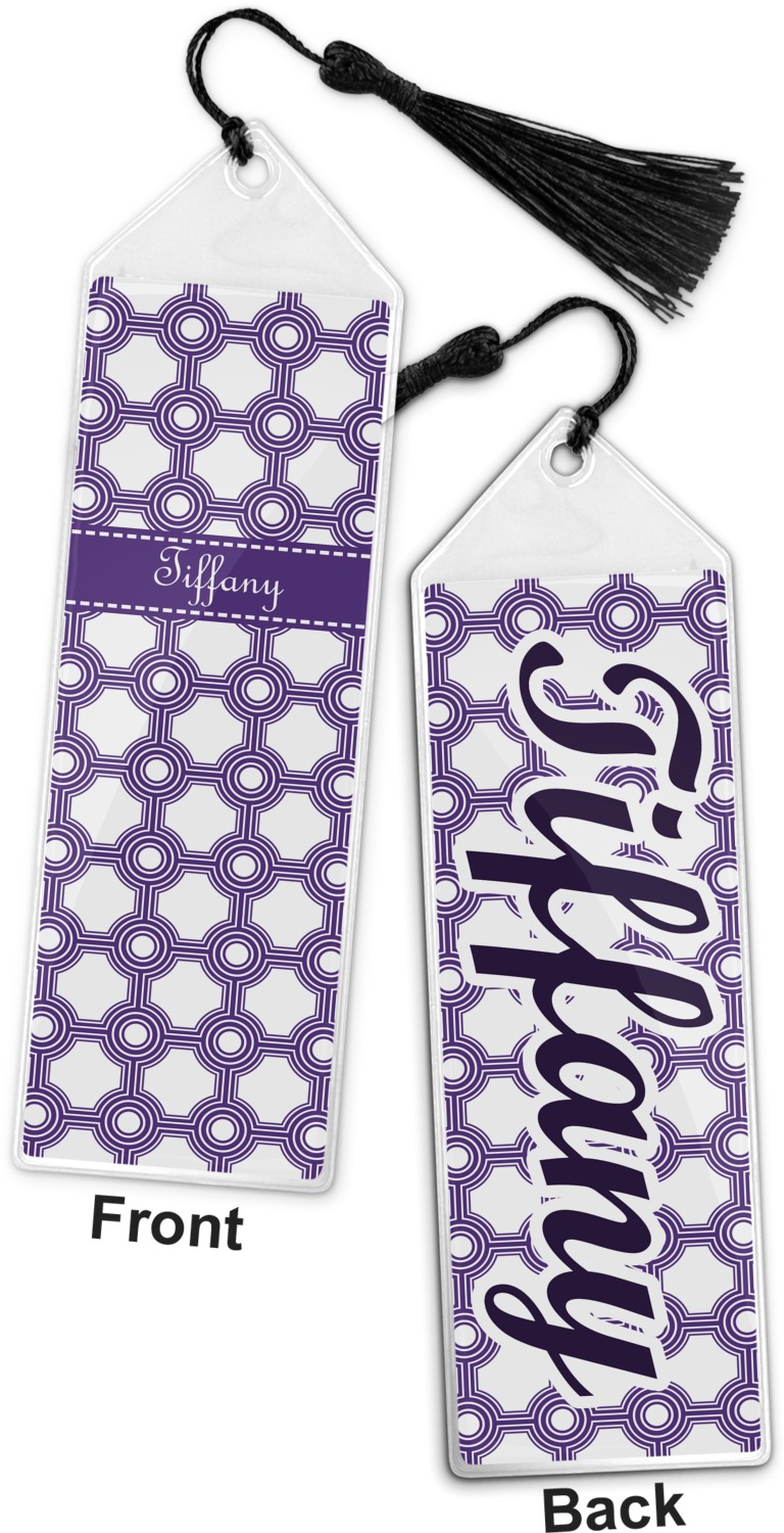 Your personalized bookmark is made of a sturdy, clear vinyl, and is approximately 7.5" x 2.25". We display your personalization on vinyl inserts that are placed on both sides. Accompanying each book marker is a black, fringe tassel that attaches to the reinforced, triangular header.