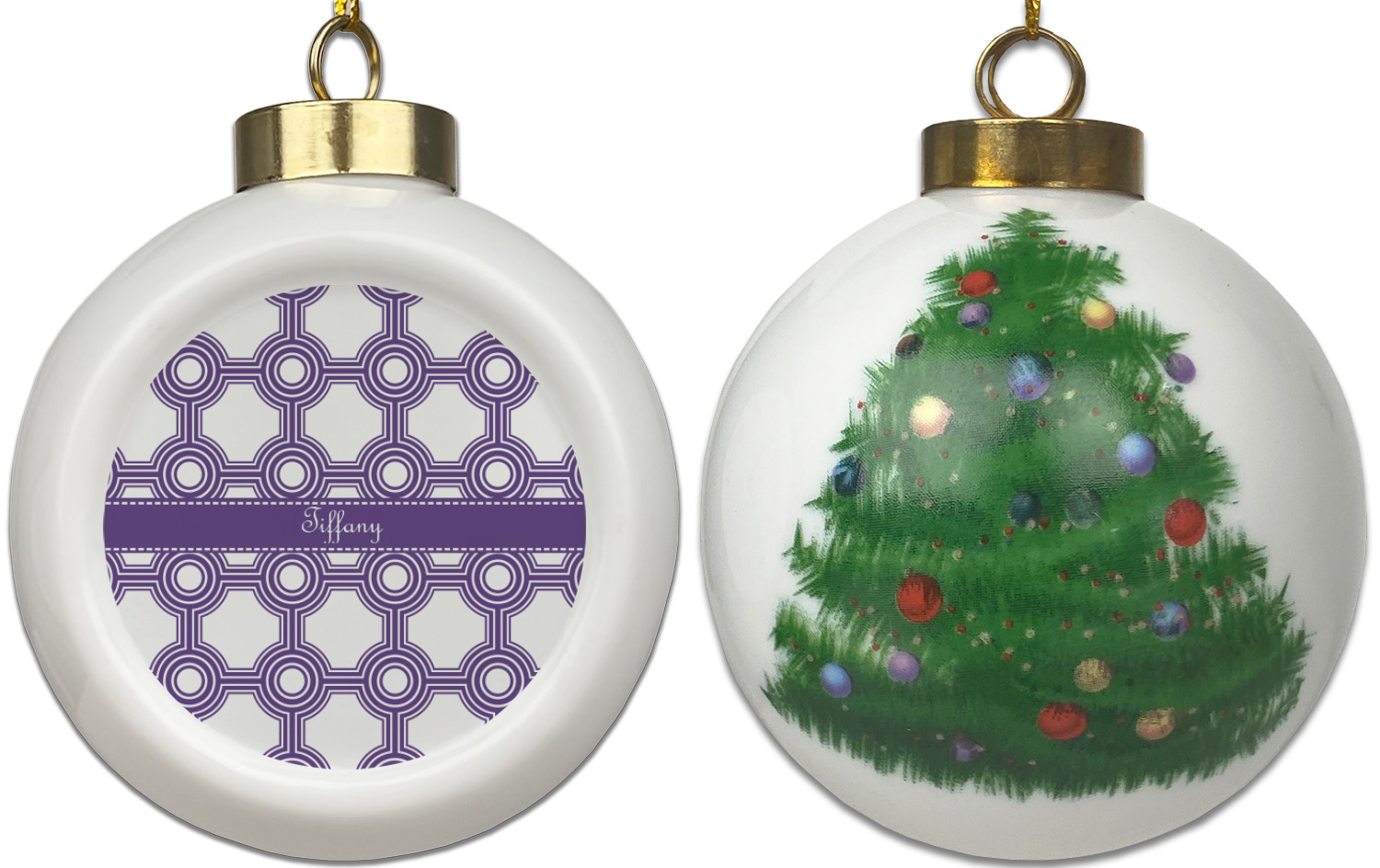 Our Christmas ornaments are a unique ceramic ball shape with a twist as it has a flat face to display your custom design! Select from one of our two design types - Christmas Tree or Poinsettia Garland - to adorn the curved back of your personal design. Each ornament measures 3H x 2.5W x 2D accompanied with a gold string accent for finishing touches to hang on your beautiful Christmas tree!