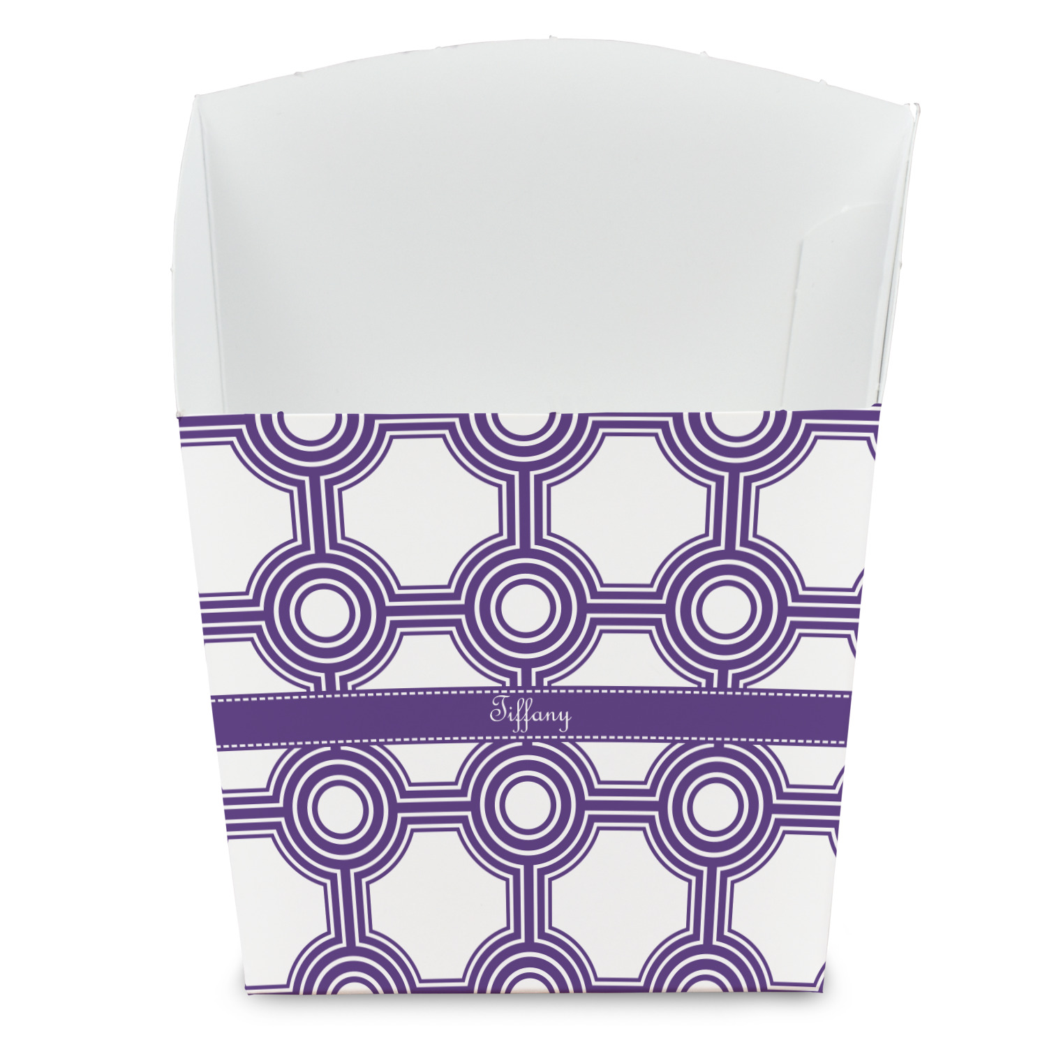 Since it is an open box, it works very well as a party snack cup (instead of plates) for different types of dry snacks and treats such as popcorn, cheezies, pretzels, chips, twizzlers, etc. This box can easily be carried with a drink all in one hand!