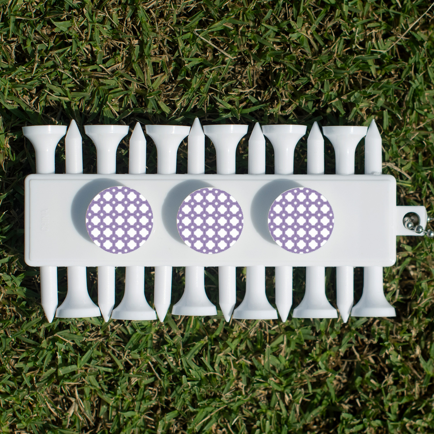With 12 tees on a lightweight, portable key chain, it almost ensures a great 18 holes. Our tees are made of white plastic and are a little over 2". Design the front and the back of the golf tee holder. Pick from over a hundred designs, colors, and personalization styles! The set even comes with three removable ball markers as well!