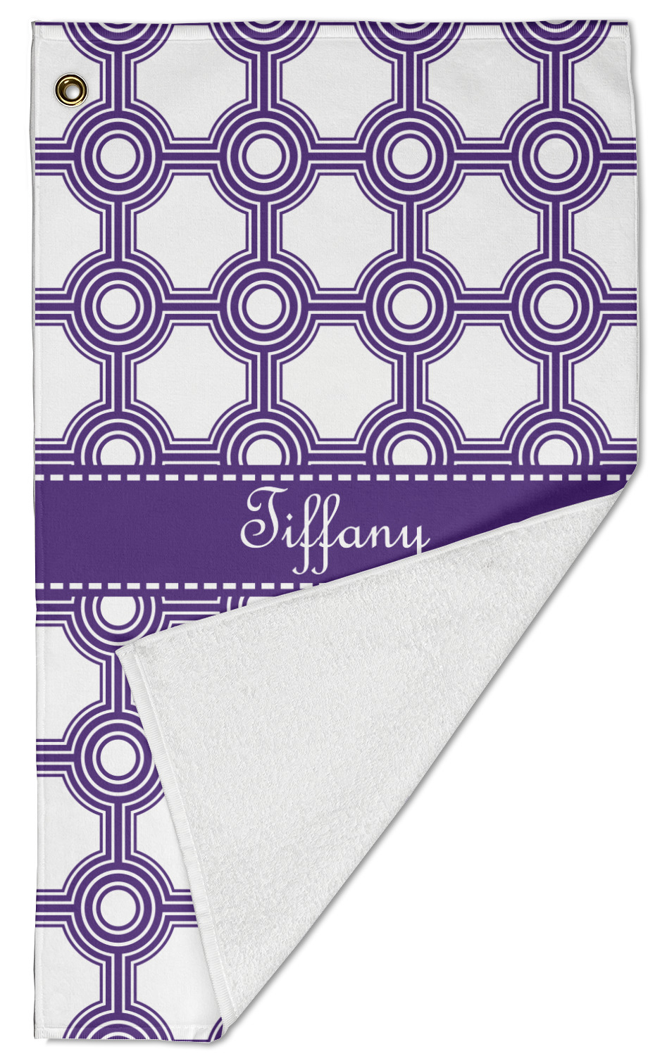 The towel is fully printed / patterned on the front polyester side; and is white on terrycloth cotton backside. The towel has grommet and a pear spring clip in the top left corner. Our golf towels are available in 100s of different prints and patterns.