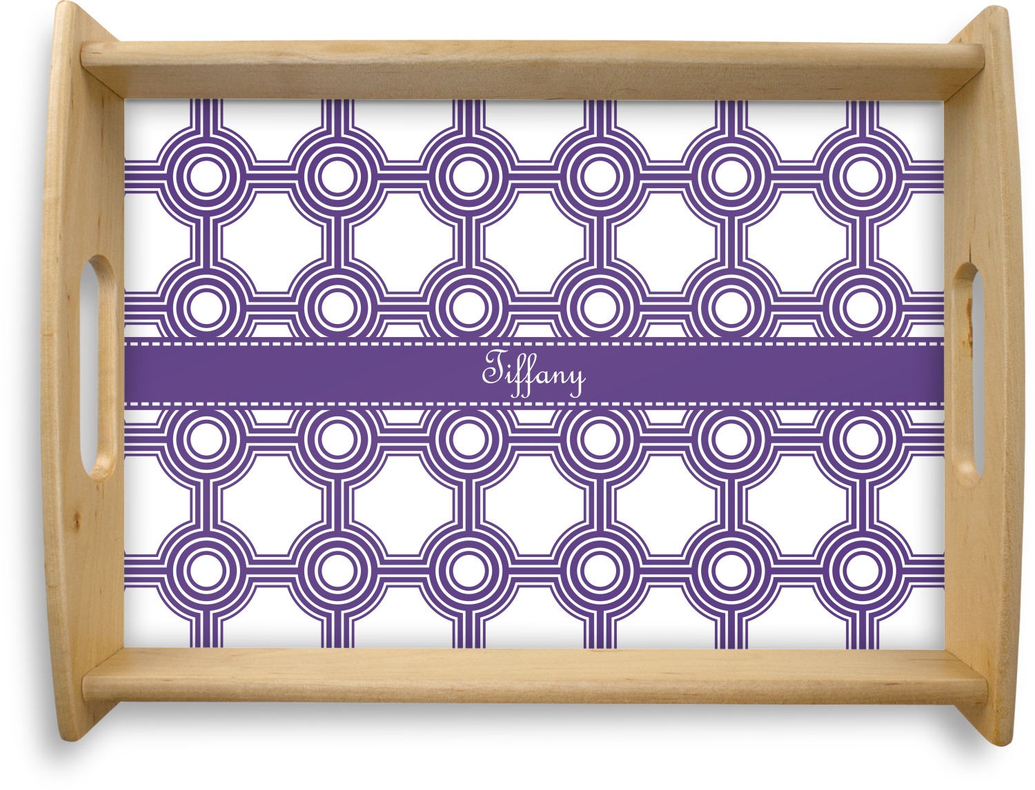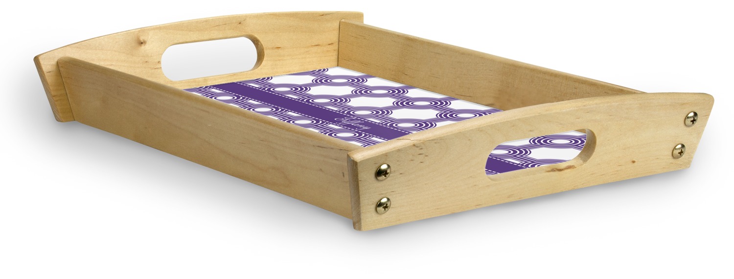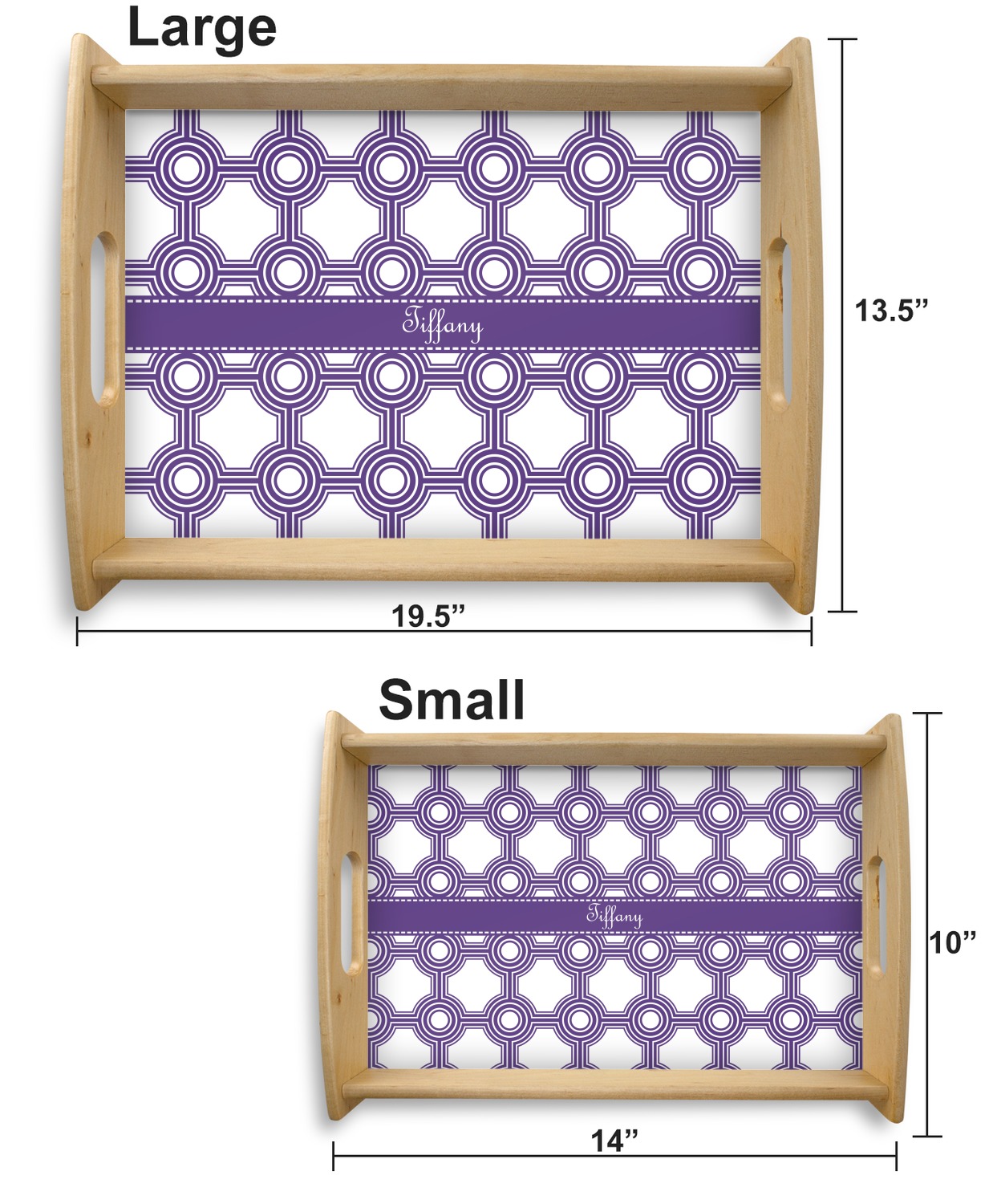 This serving tray with handles features square edges and two rounded sides, creating a very modern look. Each side is fabricated from a beautifully cut, natural wood. The bottom of the interior of the tray displays your customized design in bright, vibrant color. The tray is sold in both a black color and a natural wood look. Each variation of the wood serving tray has two sizes: Small, which is 14" x 10" x 2.25", and Large, which is 19.5" x 13.5" x 2.75".