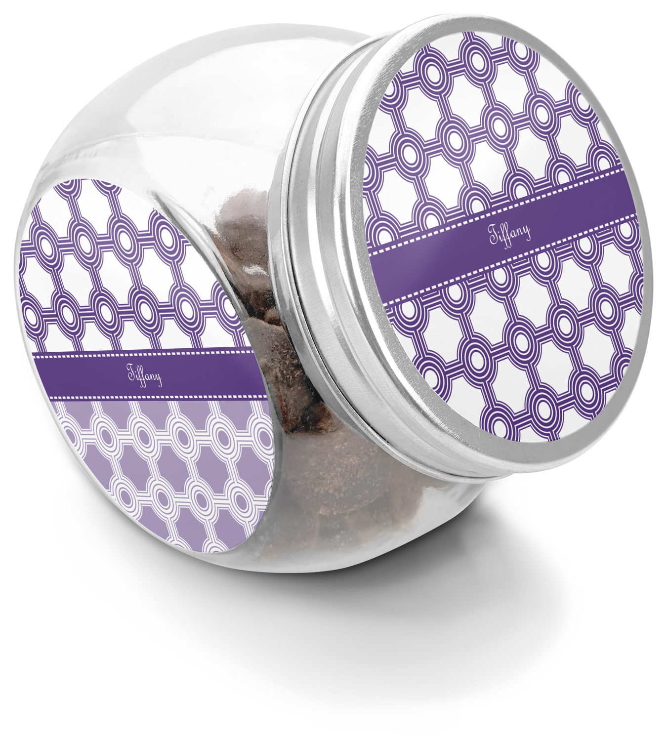 This treat jar is an excellent way to store treats for your favorite canine or feline. Moreover, their delicate, classy appearance makes them a tasteful addition to your countertop's décor. Crafted from clear glass, its unique construction and silver metal, screw-on lid allows for quick and easy access. Three, permanent, vinyl stickers are applied to both sides of the jar and lid, presenting your personalized design. The base of this glass, dog treat jar is 3.4" x 4.75", and the jar stands at 5" tall. Though on the smaller side, this jar is best suited for smaller treats or training treats.