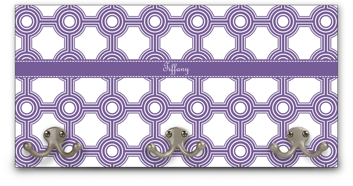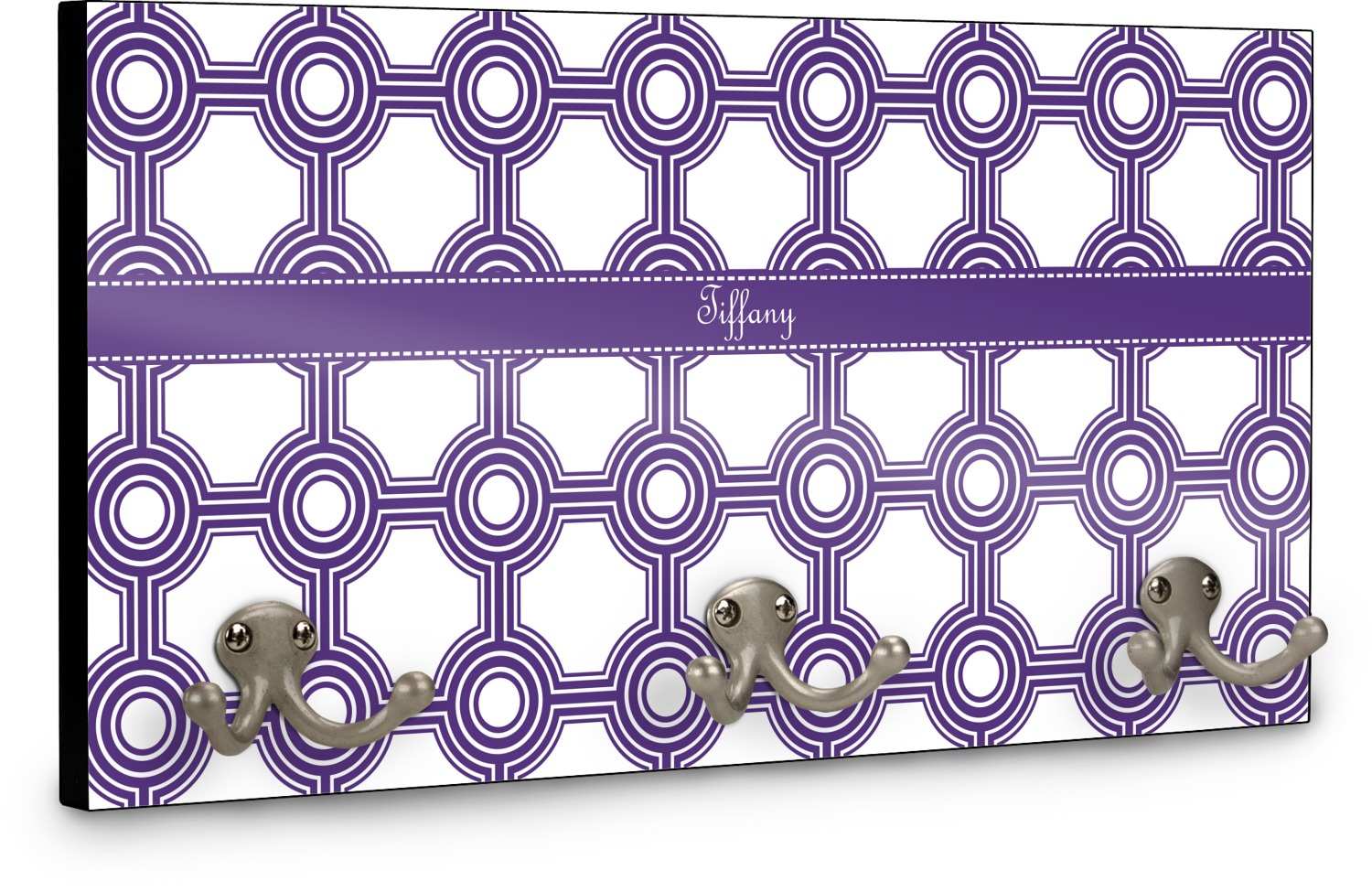 This coat rack is the perfect way to add some personality to your wall or entryway. The board is made of a strong maple that is approximately 16" x 8". The three 2-prong hooks are a sturdy metal that have three screws attaching them to the board. Your design is printed right onto the front of the board while the back and sides are a simple black.