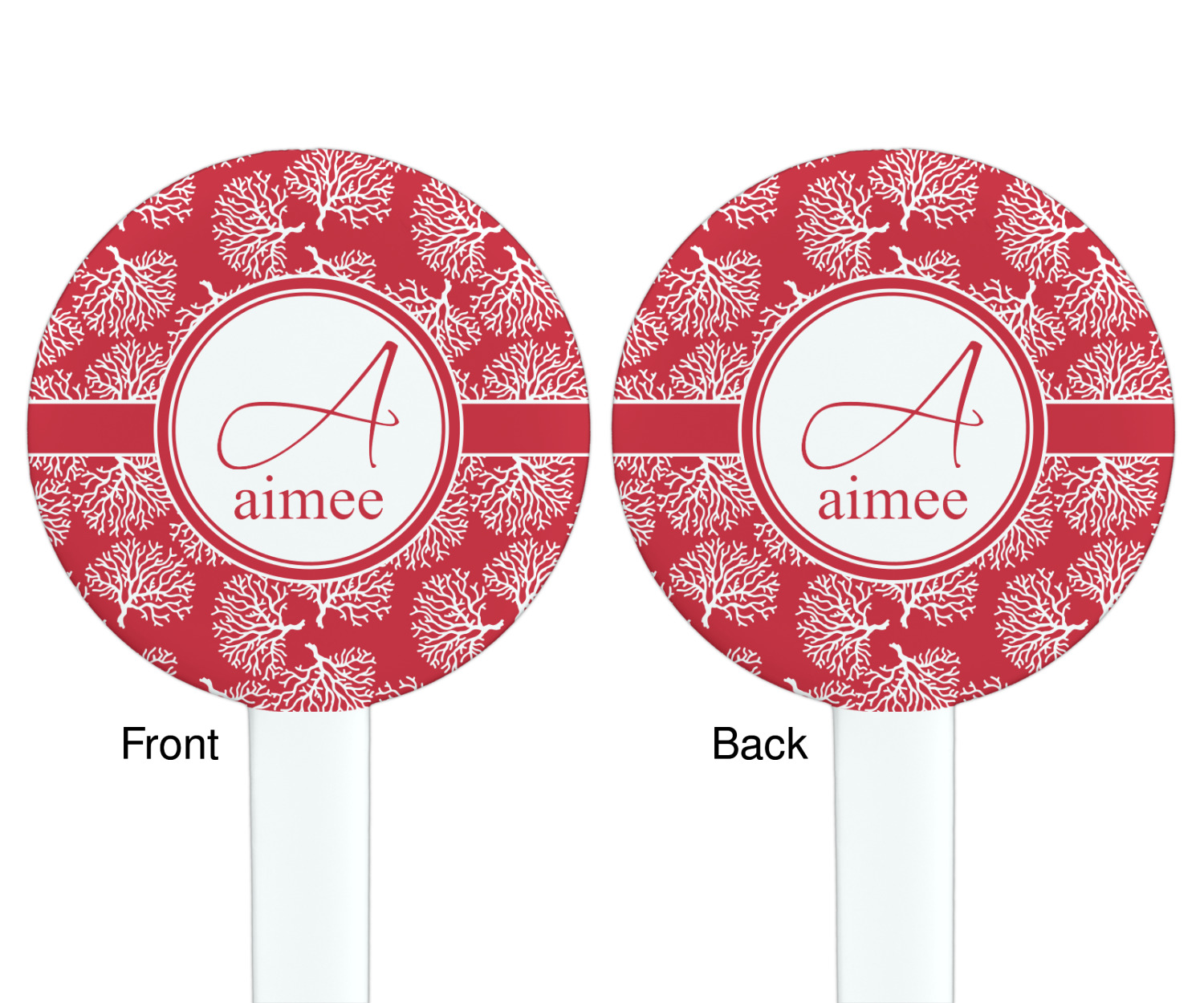 It is available in a choice of background colors. It has a classic ribbon and circle label and personalization is available as initial and name.