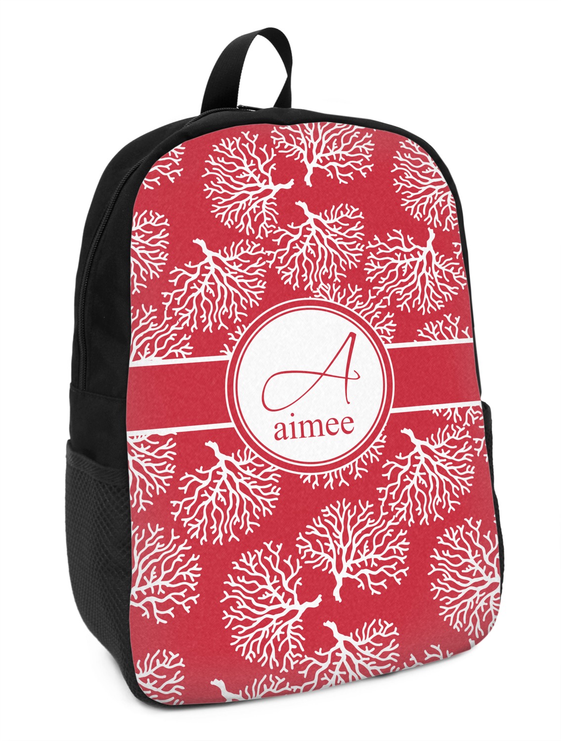 These small backpacks are made of a durable black canvas material with your personalization right on the front. The two shoulder straps are padded and easily adjustable. The bag itself measures at about 11" W x 15" H x 5" D. It's the perfect size for elementary aged kids or adults who want a smaller backpack. On the top of the bag you will find a handle to hang or carry your backpack by as well as a large zipper closure to keep all of your belongings safe inside. On each side of your backpack is a mesh pocket for a small item or water bottle. Inside your backpack you will find a spacious area with a small zipper pocket and a padded laptop slot that will fit up to a 13" laptop (13" being very snug). This is the perfect bag for any student that needs a couple books and their laptop with them at all times. It also works great as a carry on for traveling!