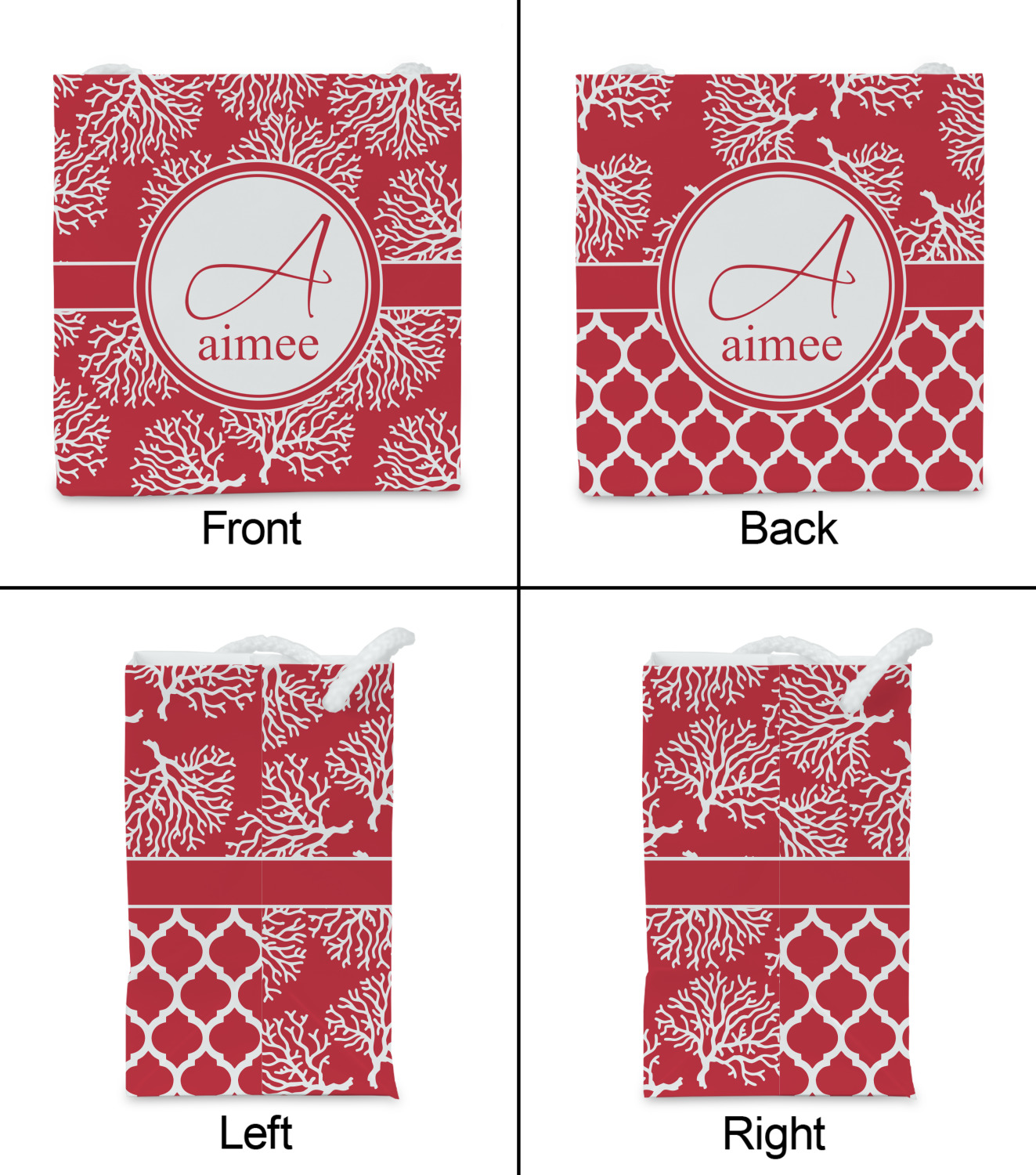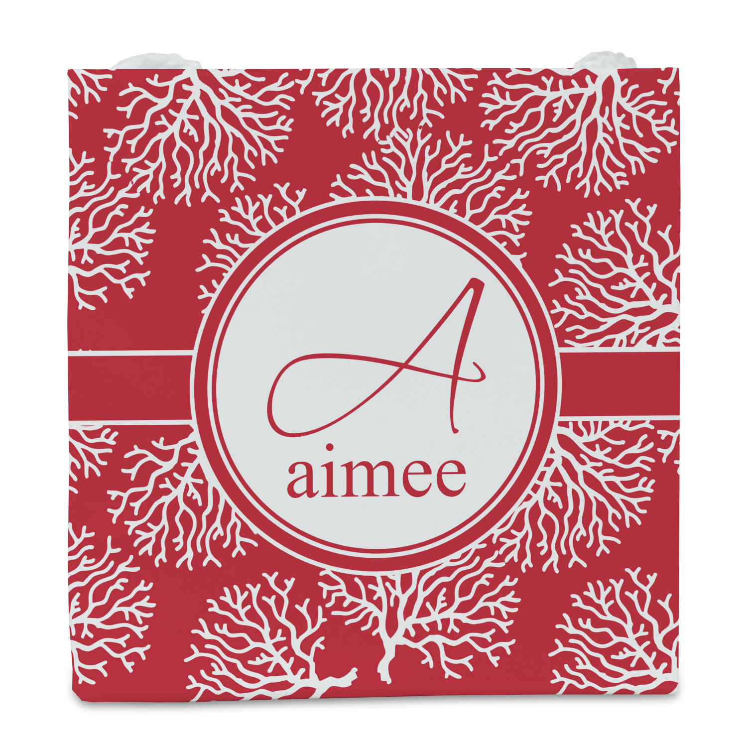 It is available in a choice of background colors. It has a classic ribbon and circle label and personalization is available as initial and name.