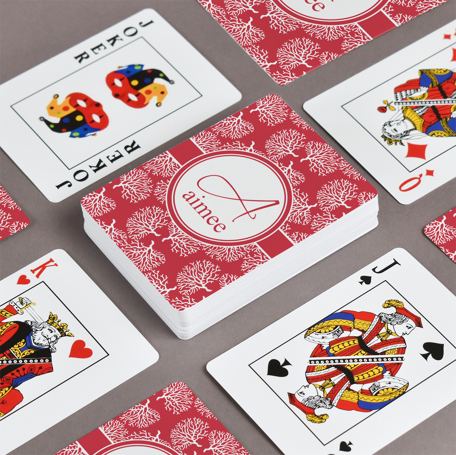 The customization / personalization is printed on the back side. The playing cards have a low gloss coating on both sides. The cards are packaged in a clear plastic box.