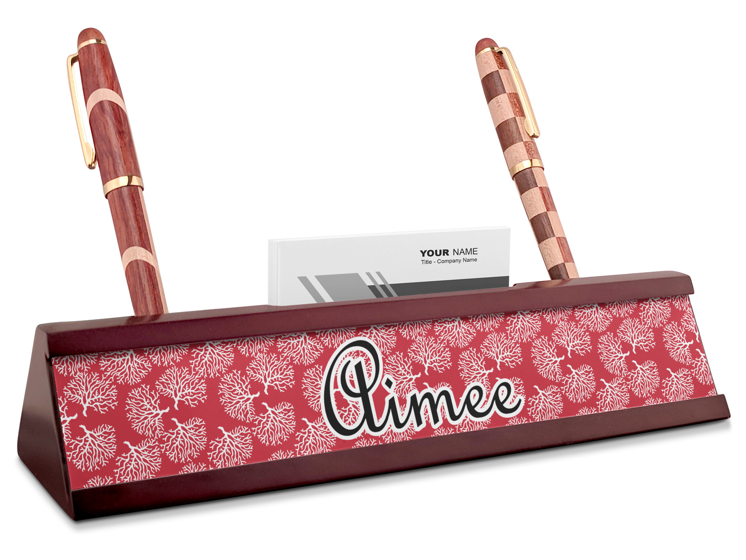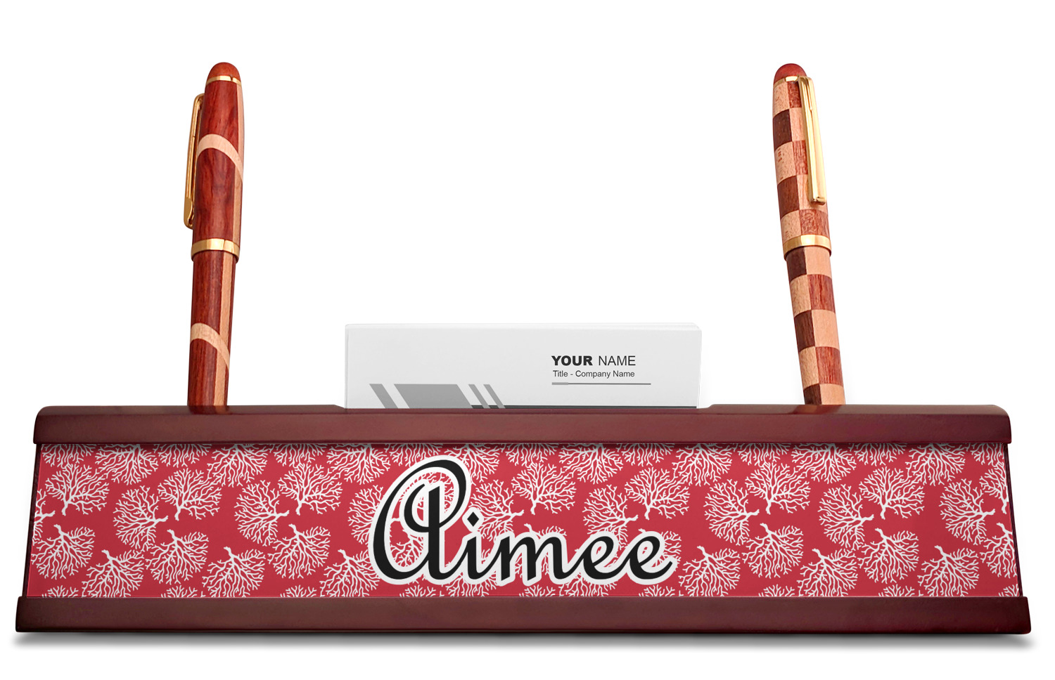 Your desk name plates are crafted from a high-quality, dark-cherry mahogany. At approximately 9.5 by 1.875 by 2.5 inches, this name plaque will fit perfectly, front and center, on your desk. Your customization spans across the entire face of the nameplate. Behind the nameplate lies a skinny slot that can fit approximately 15, traditionally-sized, business cards. You can also store your writing utensils on either side of this custom desk name plate.