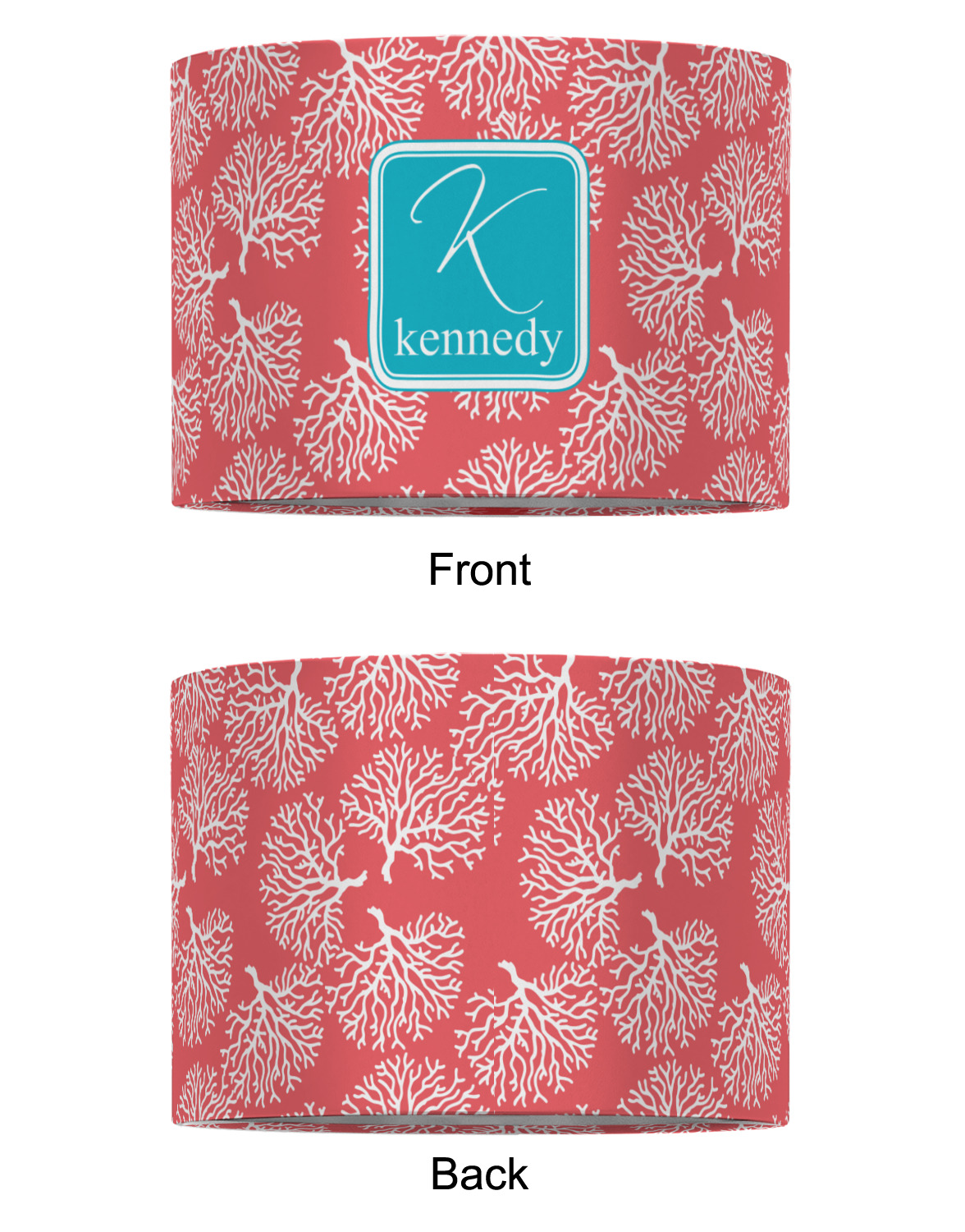 The coral background in this design is absolutely beautiful. The square label highlights the personalization of an initial and name of your choice in the stunning teal blue color.