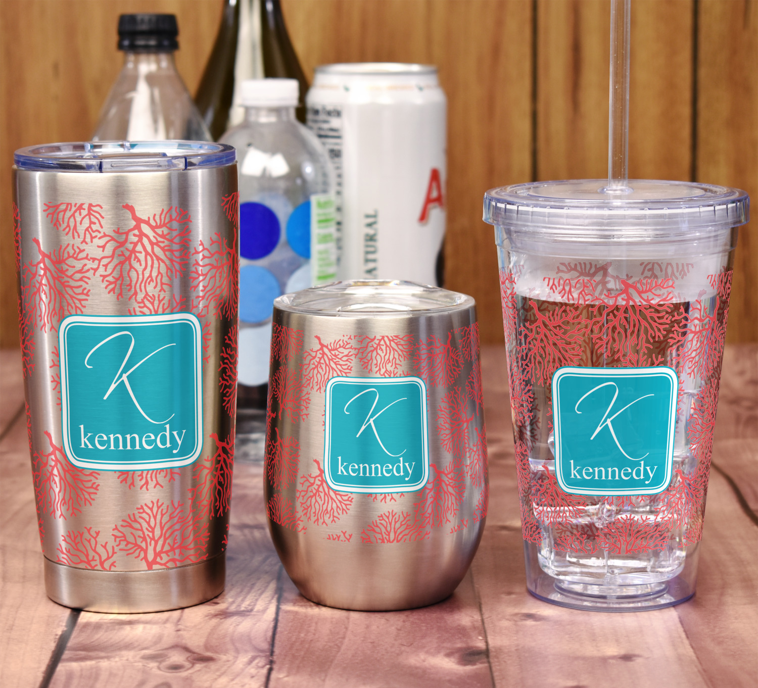 The coral background in this design is absolutely beautiful. The square label highlights the personalization of an initial and name of your choice in the stunning teal blue color.