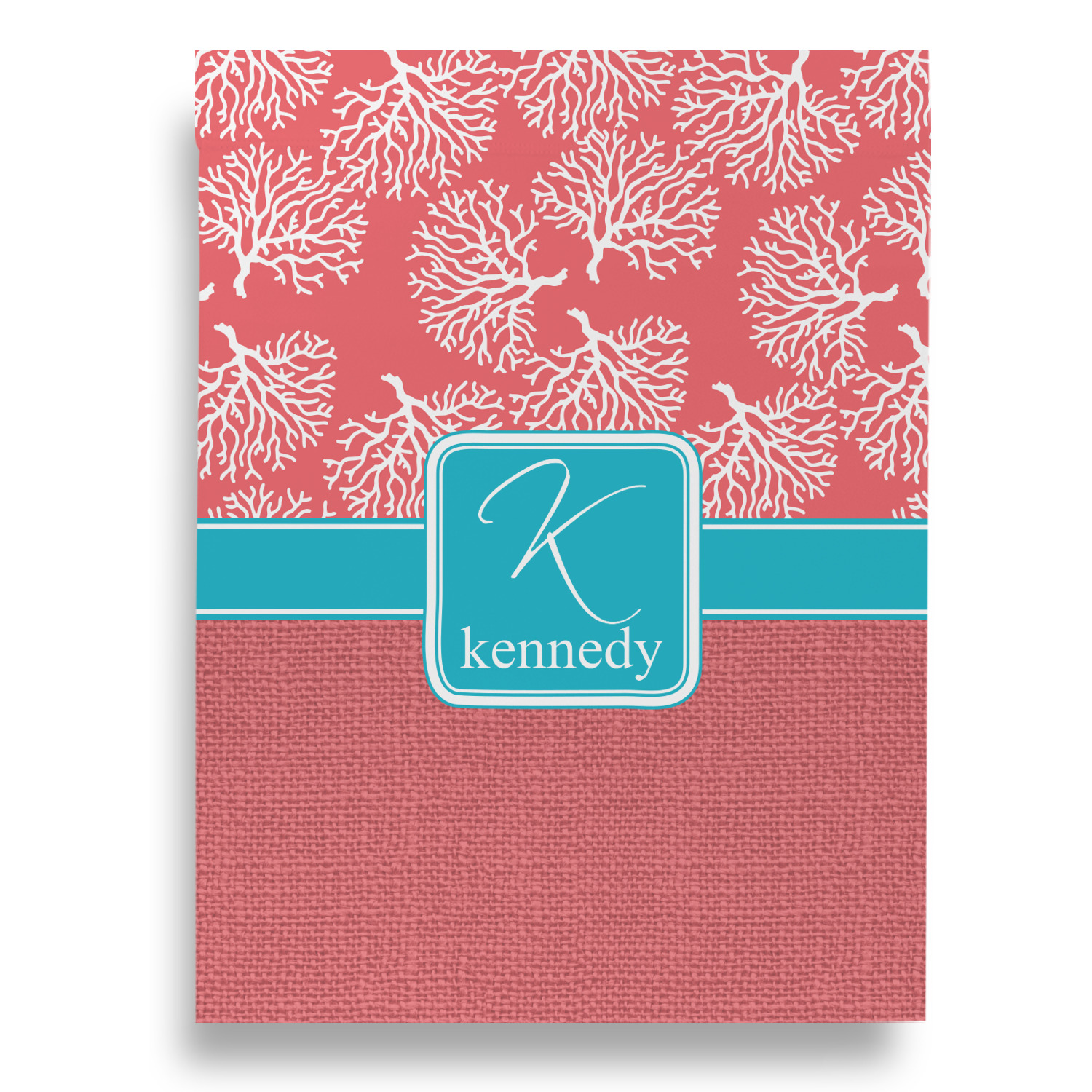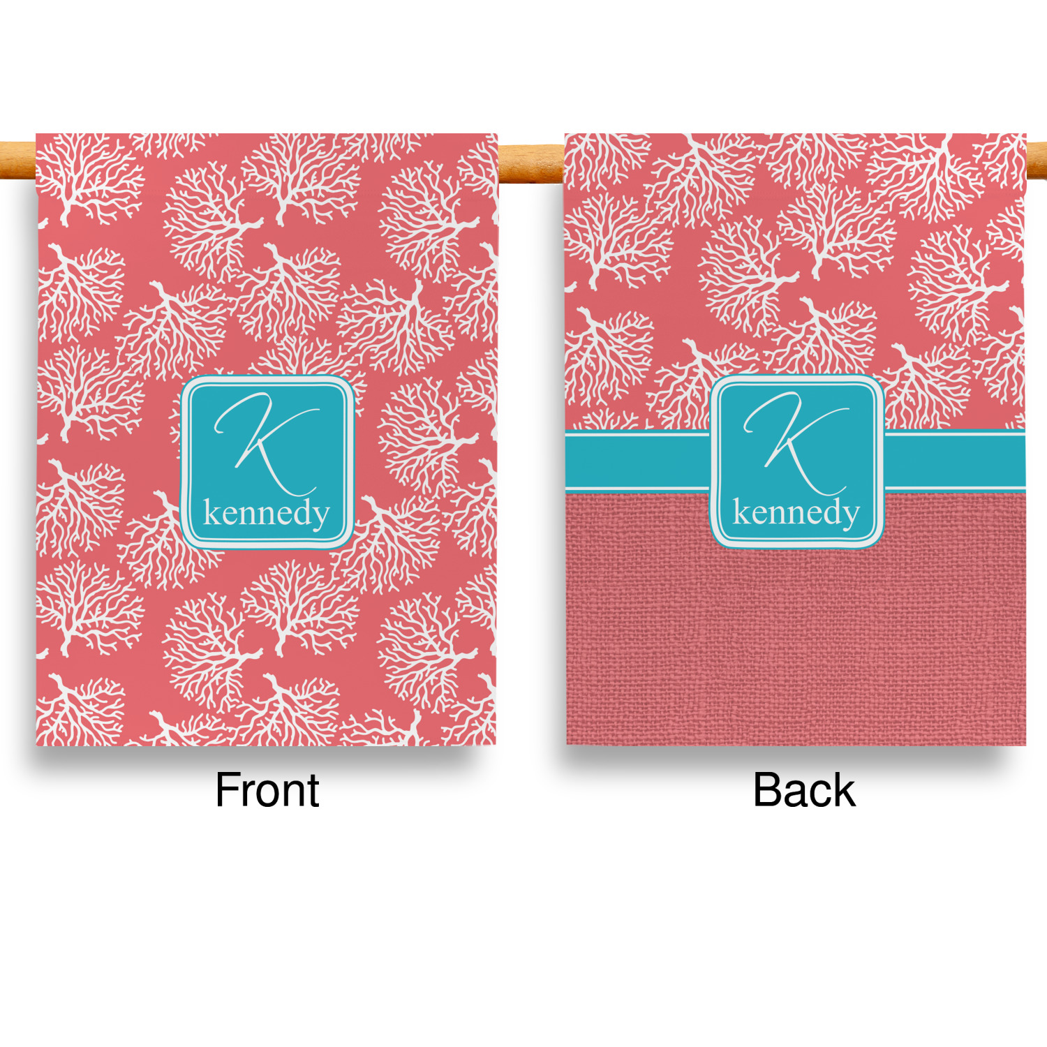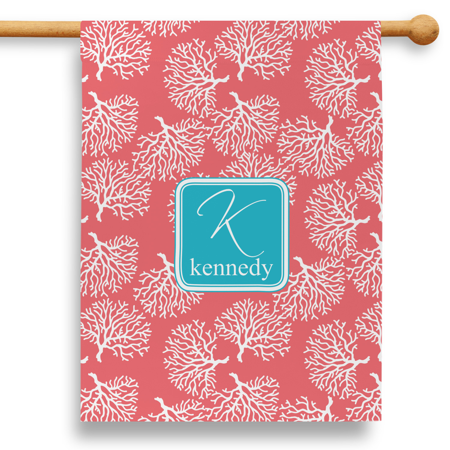 The coral background in this design is absolutely beautiful. The square label highlights the personalization of an initial and name of your choice in the stunning teal blue color.