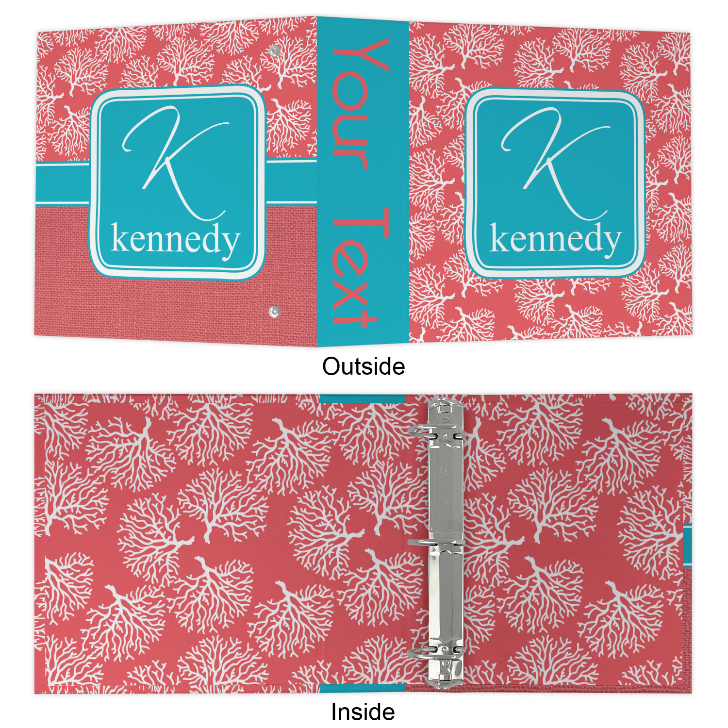 The coral background in this design is absolutely beautiful. The square label highlights the personalization of an initial and name of your choice in the stunning teal blue color.