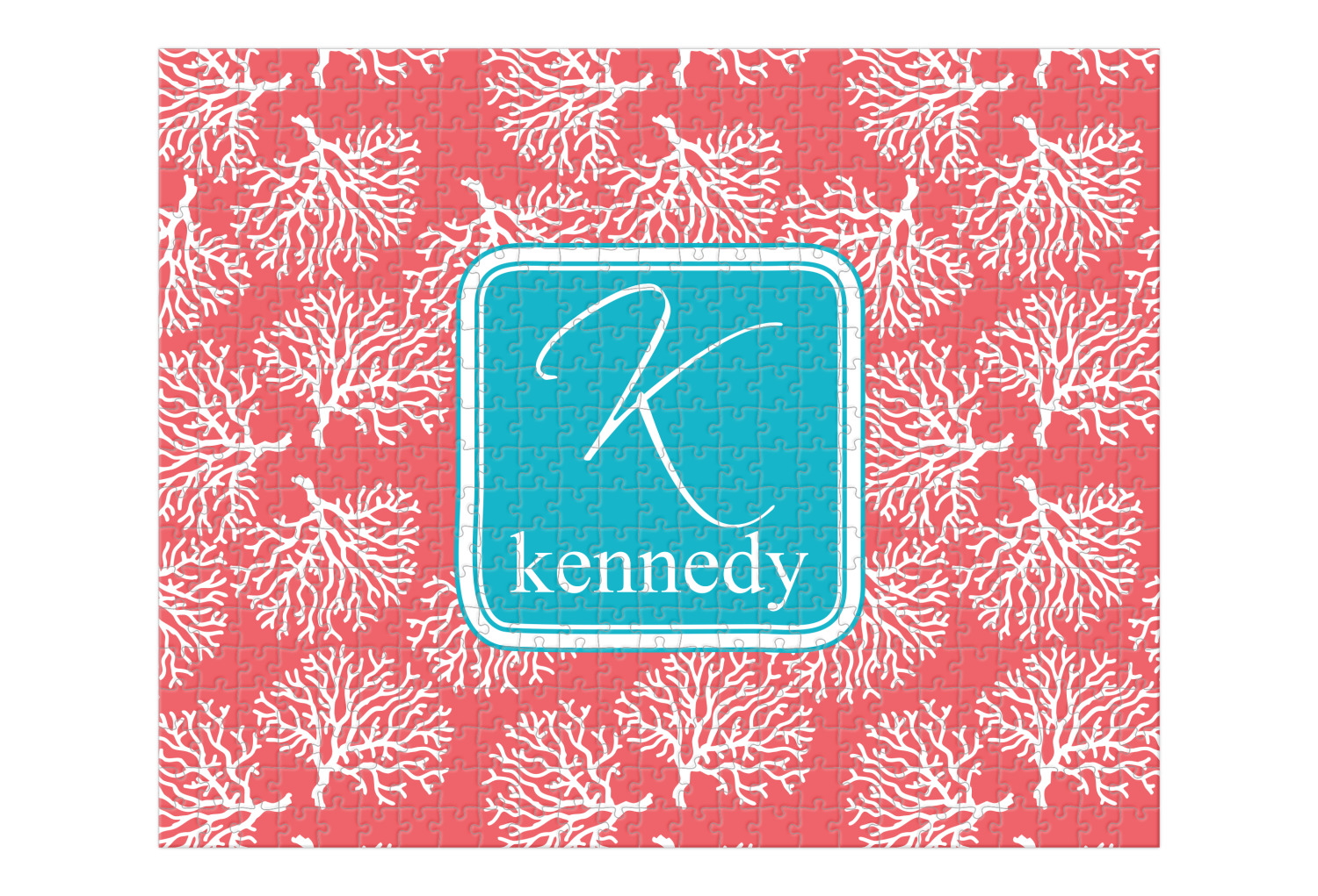 The coral background in this design is absolutely beautiful. The square label highlights the personalization of an initial and name of your choice in the stunning teal blue color.