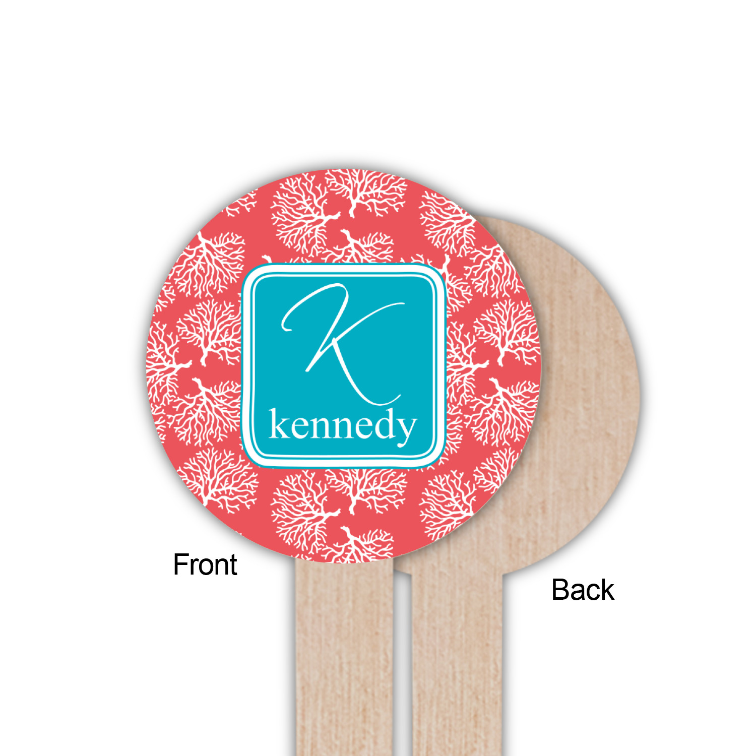 The coral background in this design is absolutely beautiful. The square label highlights the personalization of an initial and name of your choice in the stunning teal blue color.
