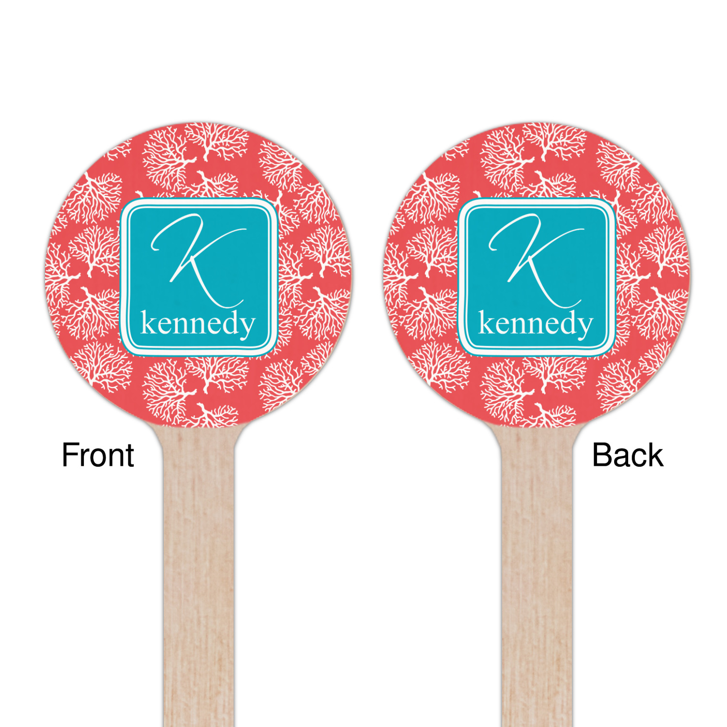 The coral background in this design is absolutely beautiful. The square label highlights the personalization of an initial and name of your choice in the stunning teal blue color.