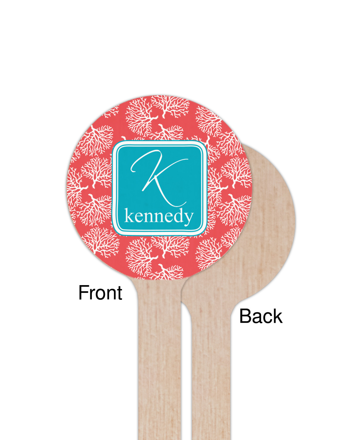 The coral background in this design is absolutely beautiful. The square label highlights the personalization of an initial and name of your choice in the stunning teal blue color.