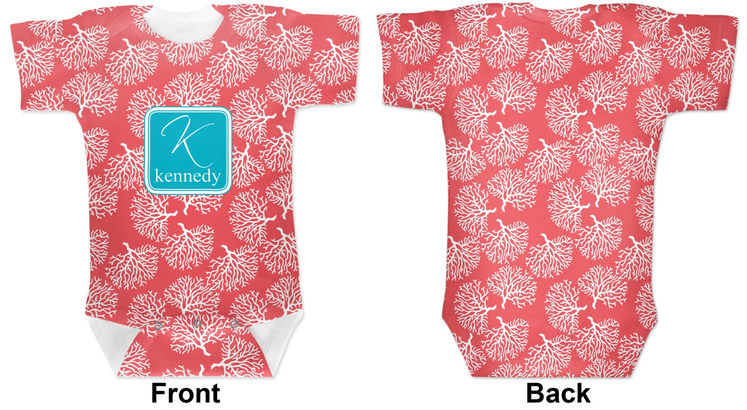 The coral background in this design is absolutely beautiful. The square label highlights the personalization of an initial and name of your choice in the stunning teal blue color.
