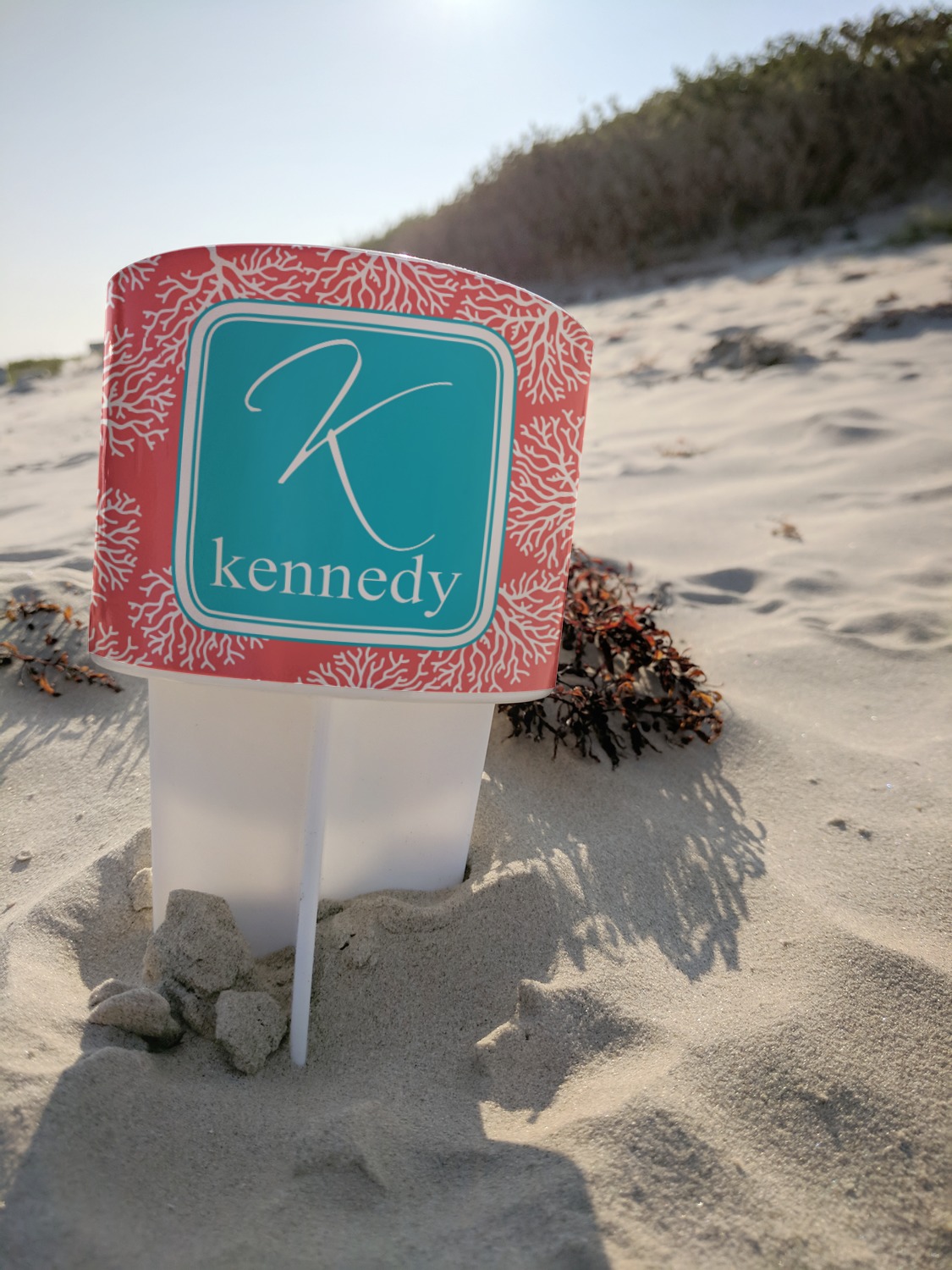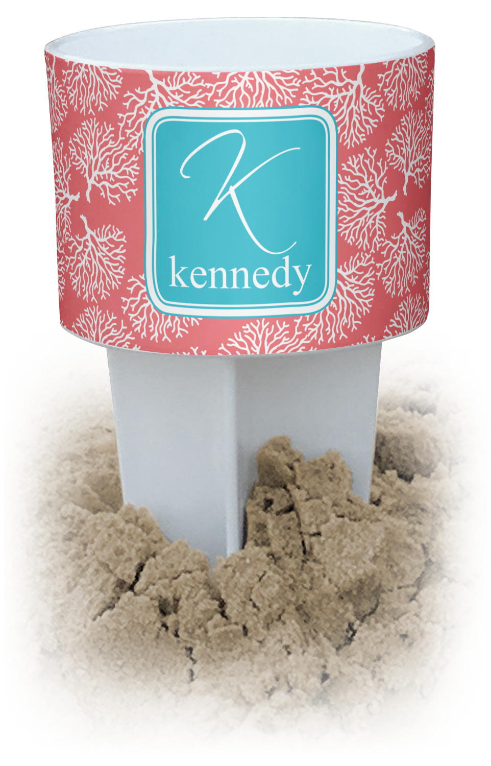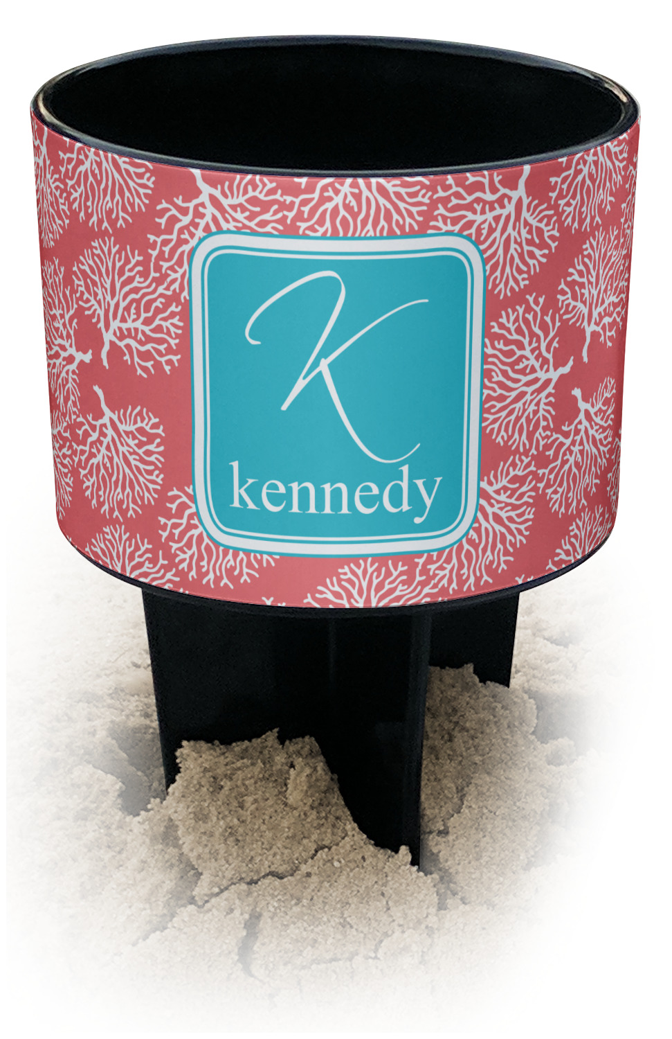 This cup holder has a large stake at its bottom that anchors it to the sand or ground below, while the cup holder rests above the stake. The entire drink holder is made of durable plastic and displays your customization around the cup holder portion. We sell these personalized beach spikers in two different colors: black and white.