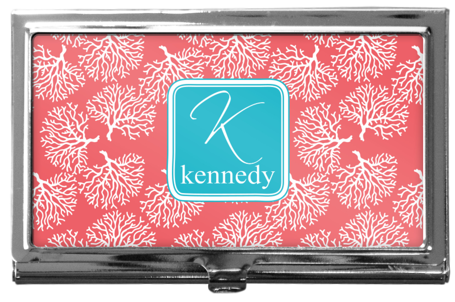 The coral background in this design is absolutely beautiful. The square label highlights the personalization of an initial and name of your choice in the stunning teal blue color.
