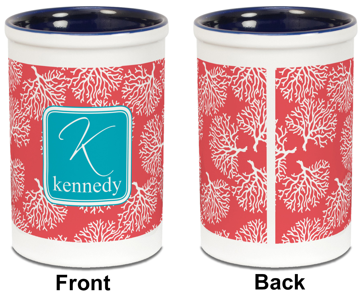 Both the blue and black pencil holders are a ceramic material, giving you a sturdy and long-lasting pen and pencil holder. We print your designs on the exterior of the pencil cup, covering most of the outside surface. There is a small white border on the top and bottom of the exterior of the pen holder, setting apart your design from the interior's color. Our ceramic pen caddy is roughly 3.5" x 3.5" x 5" in dimensions.