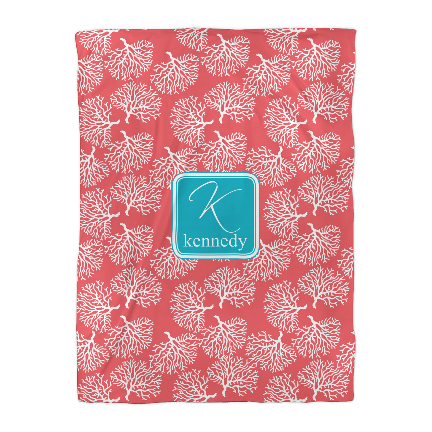 The coral background in this design is absolutely beautiful. The square label highlights the personalization of an initial and name of your choice in the stunning teal blue color.