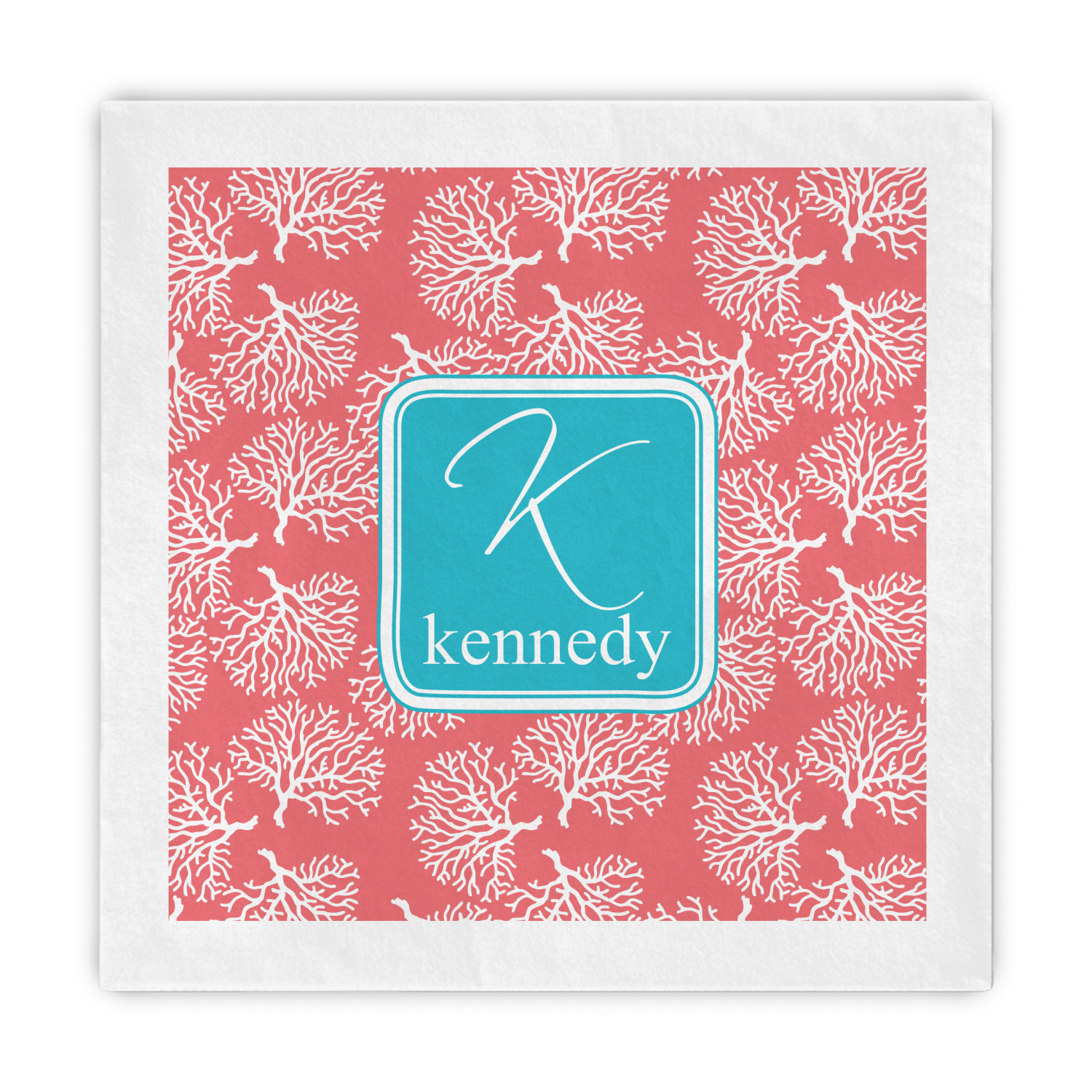 The coral background in this design is absolutely beautiful. The square label highlights the personalization of an initial and name of your choice in the stunning teal blue color.