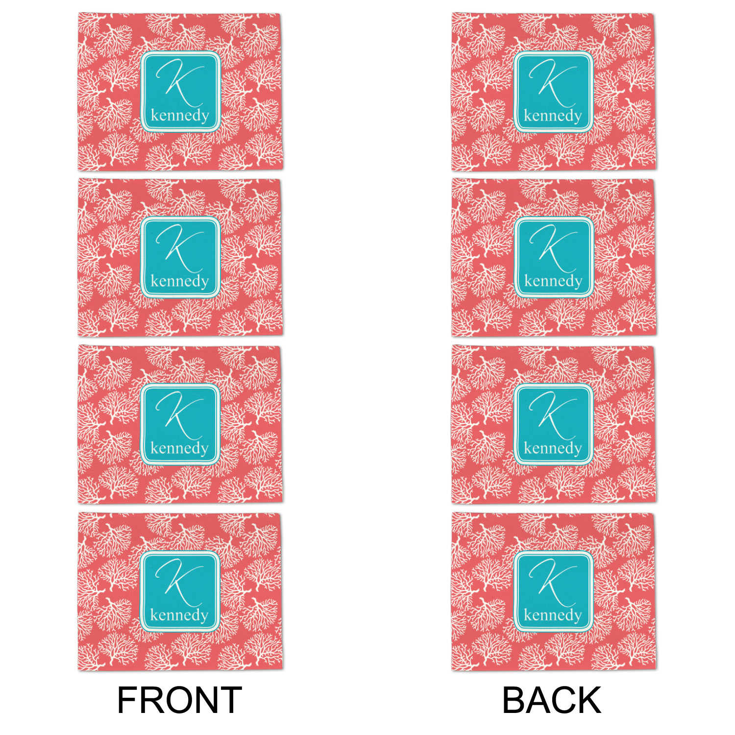 The coral background in this design is absolutely beautiful. The square label highlights the personalization of an initial and name of your choice in the stunning teal blue color.