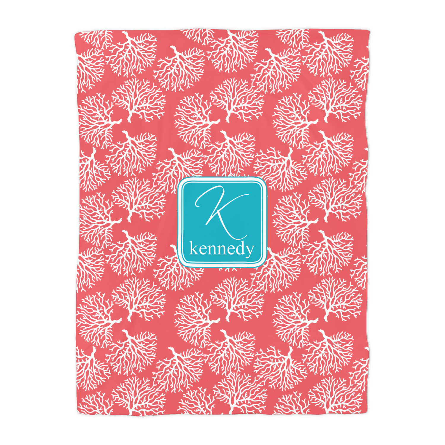 The coral background in this design is absolutely beautiful. The square label highlights the personalization of an initial and name of your choice in the stunning teal blue color.