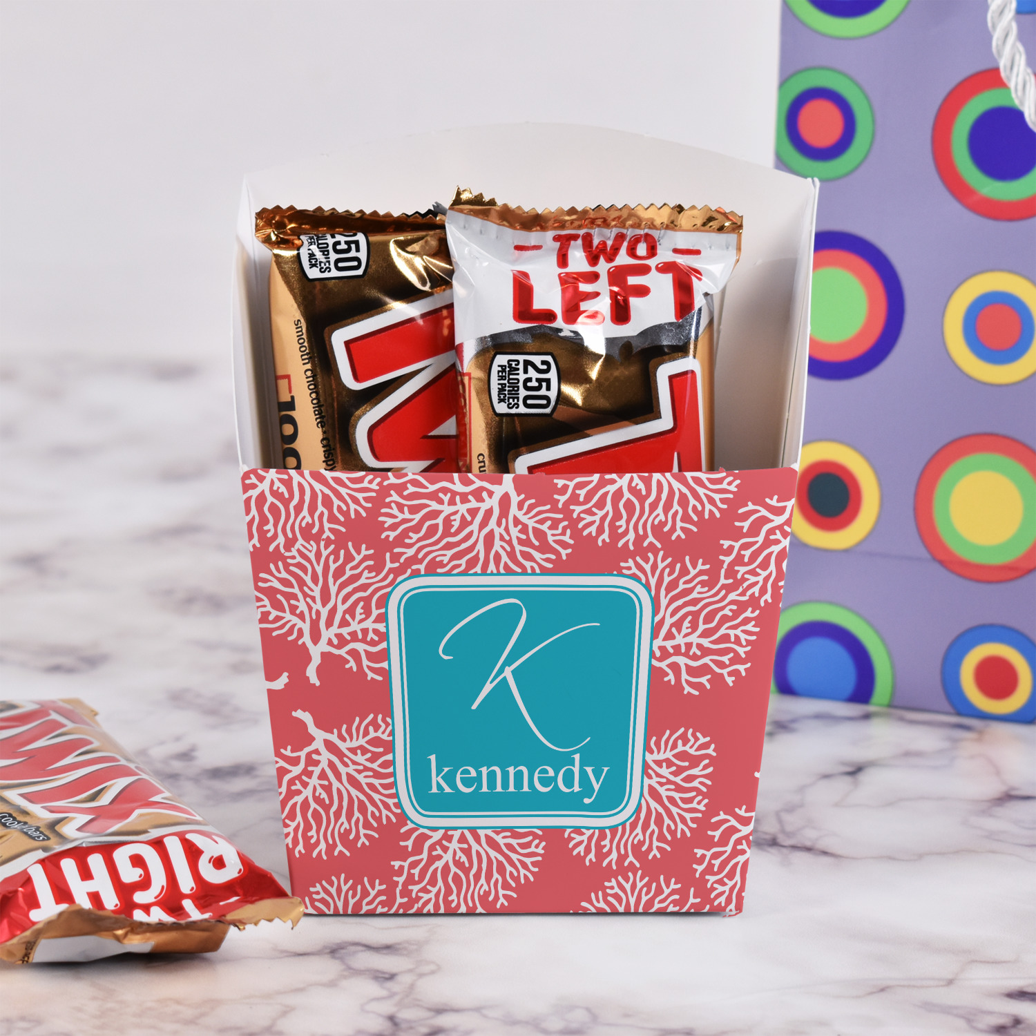 The coral background in this design is absolutely beautiful. The square label highlights the personalization of an initial and name of your choice in the stunning teal blue color.