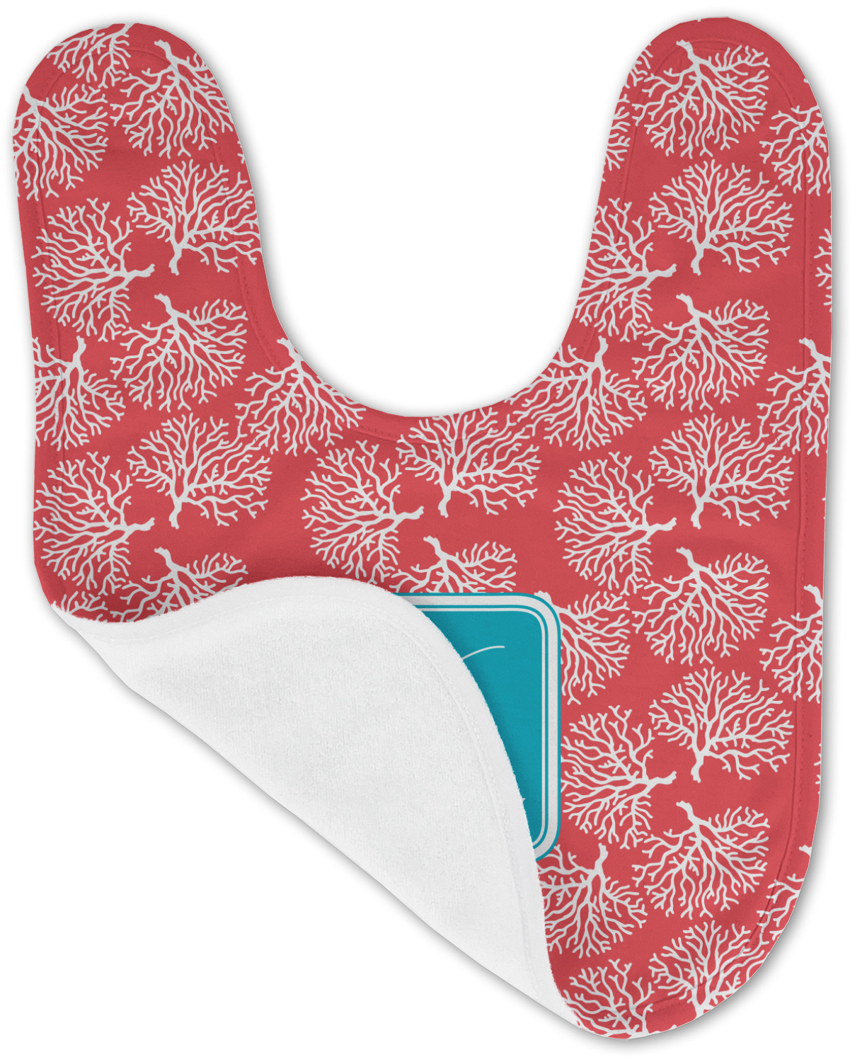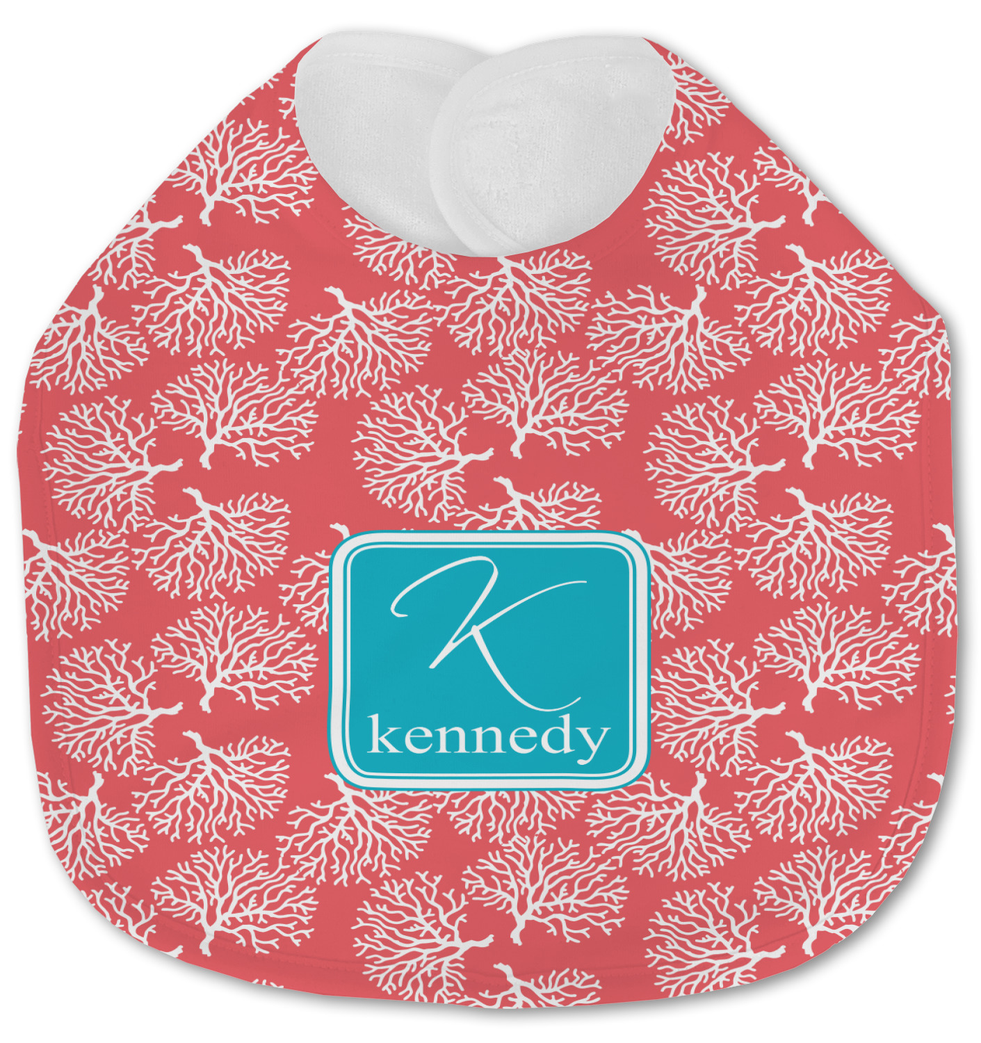 The coral background in this design is absolutely beautiful. The square label highlights the personalization of an initial and name of your choice in the stunning teal blue color.