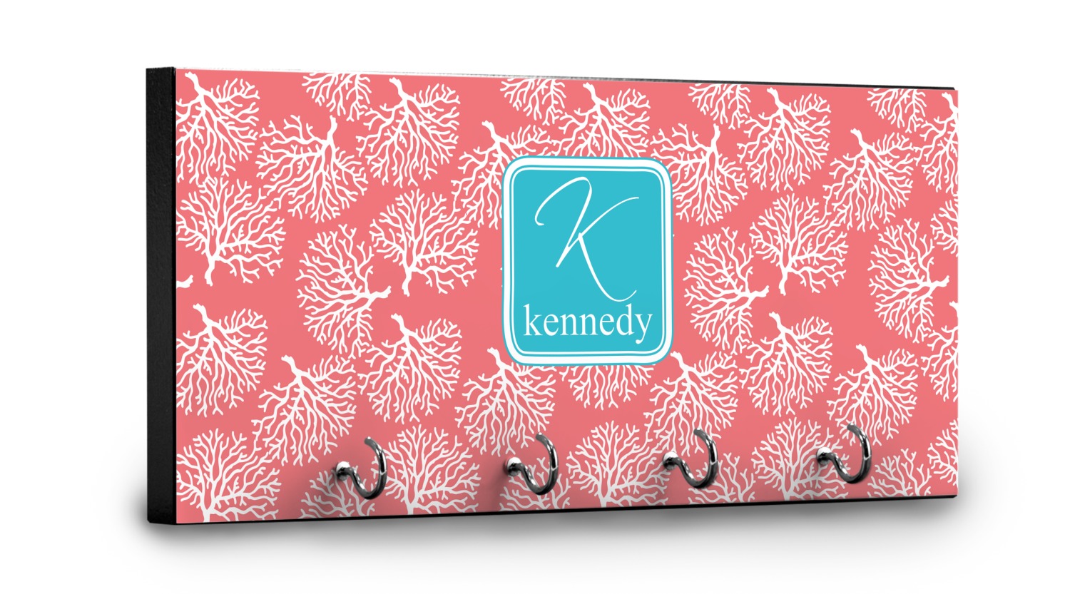The coral background in this design is absolutely beautiful. The square label highlights the personalization of an initial and name of your choice in the stunning teal blue color.