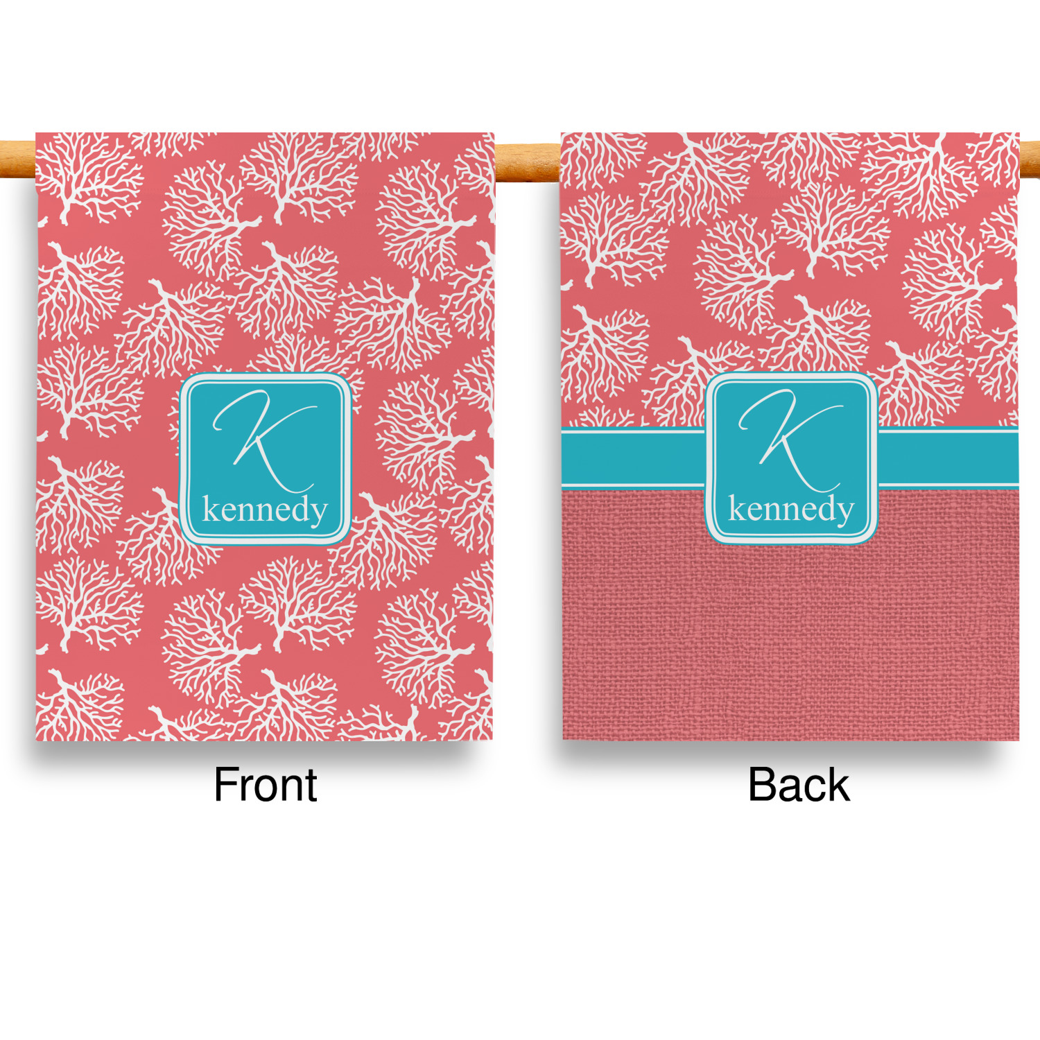 These custom garden flags are made of a durable, double-ply, polyester weave, allowing them to withstand the elements year round. The small flags measure at approximately 12 by 18 inches. The large flags measure out to 28 by 37 inches. You can order these decorative flags with your customization printed on the front only, or the front and back.