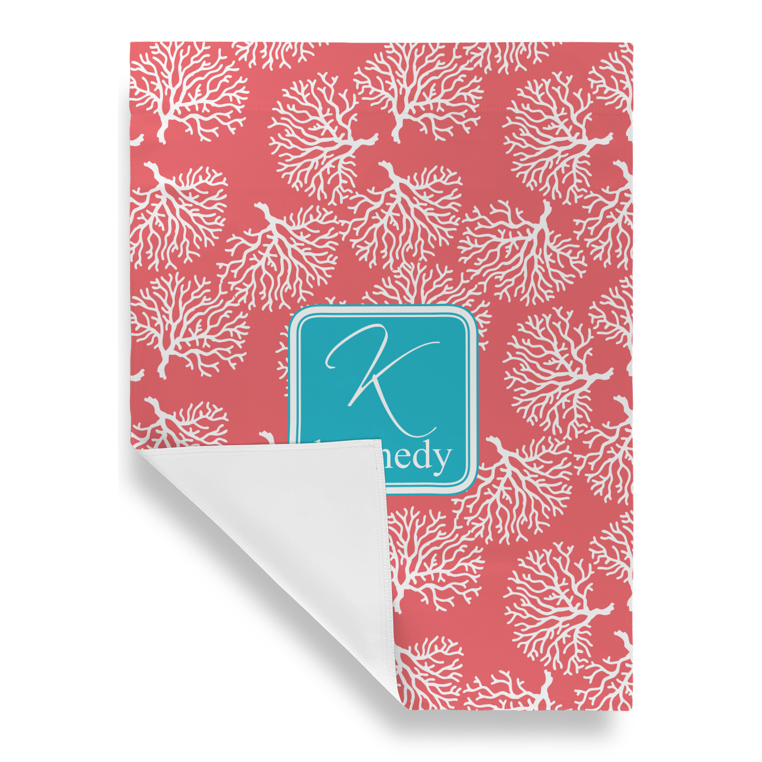 The coral background in this design is absolutely beautiful. The square label highlights the personalization of an initial and name of your choice in the stunning teal blue color.