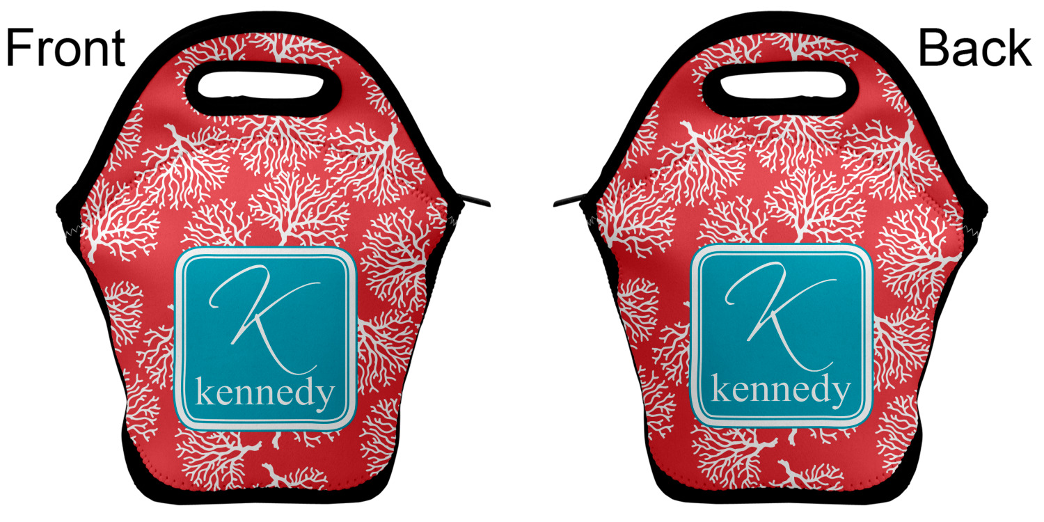 Our personalized lunch bags are made from a strong neoprene, and secure with a zipper closure that lines the top of the bag.The edges of the neoprene are sewn together with a heavy duty stitch, adding to the durability of the bag. The is accompanied by a reinforced handle at its top, for the easy transport of your lunch. We display your personalization across both the front and back of this neoprene lunch bag, while the remaining sides are a sleek black in color. Each bag measures at 13.5 inches tall, and 11.5 inches wide.