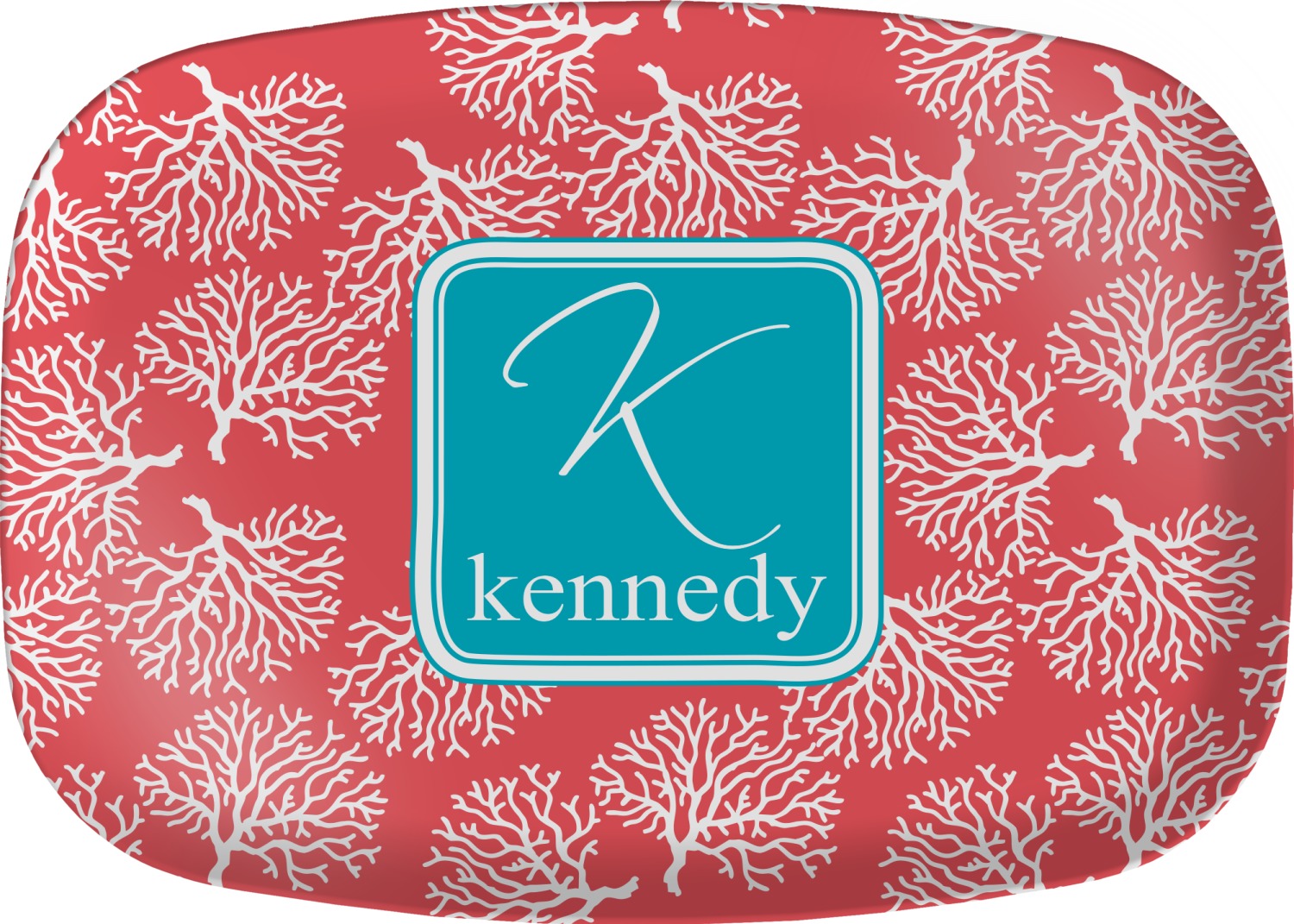 The coral background in this design is absolutely beautiful. The square label highlights the personalization of an initial and name of your choice in the stunning teal blue color.