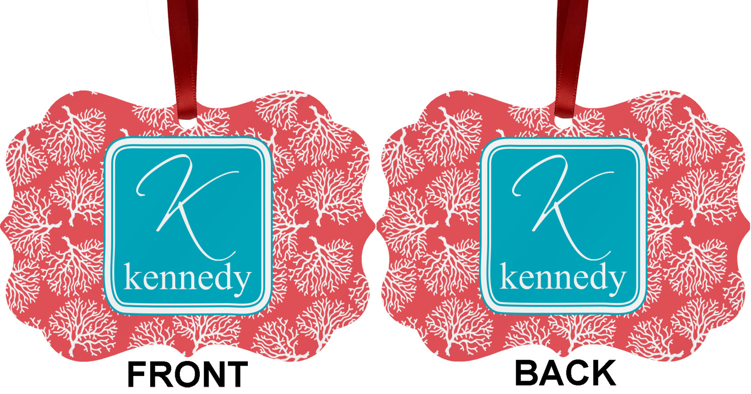 The coral background in this design is absolutely beautiful. The square label highlights the personalization of an initial and name of your choice in the stunning teal blue color.