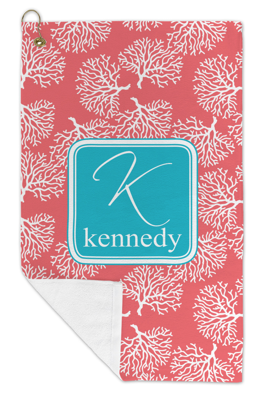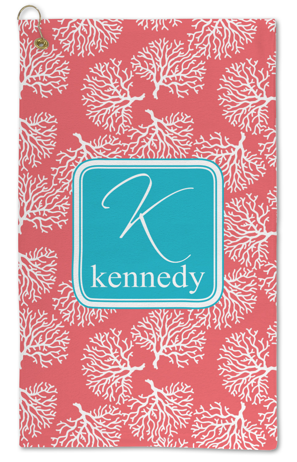 The coral background in this design is absolutely beautiful. The square label highlights the personalization of an initial and name of your choice in the stunning teal blue color.