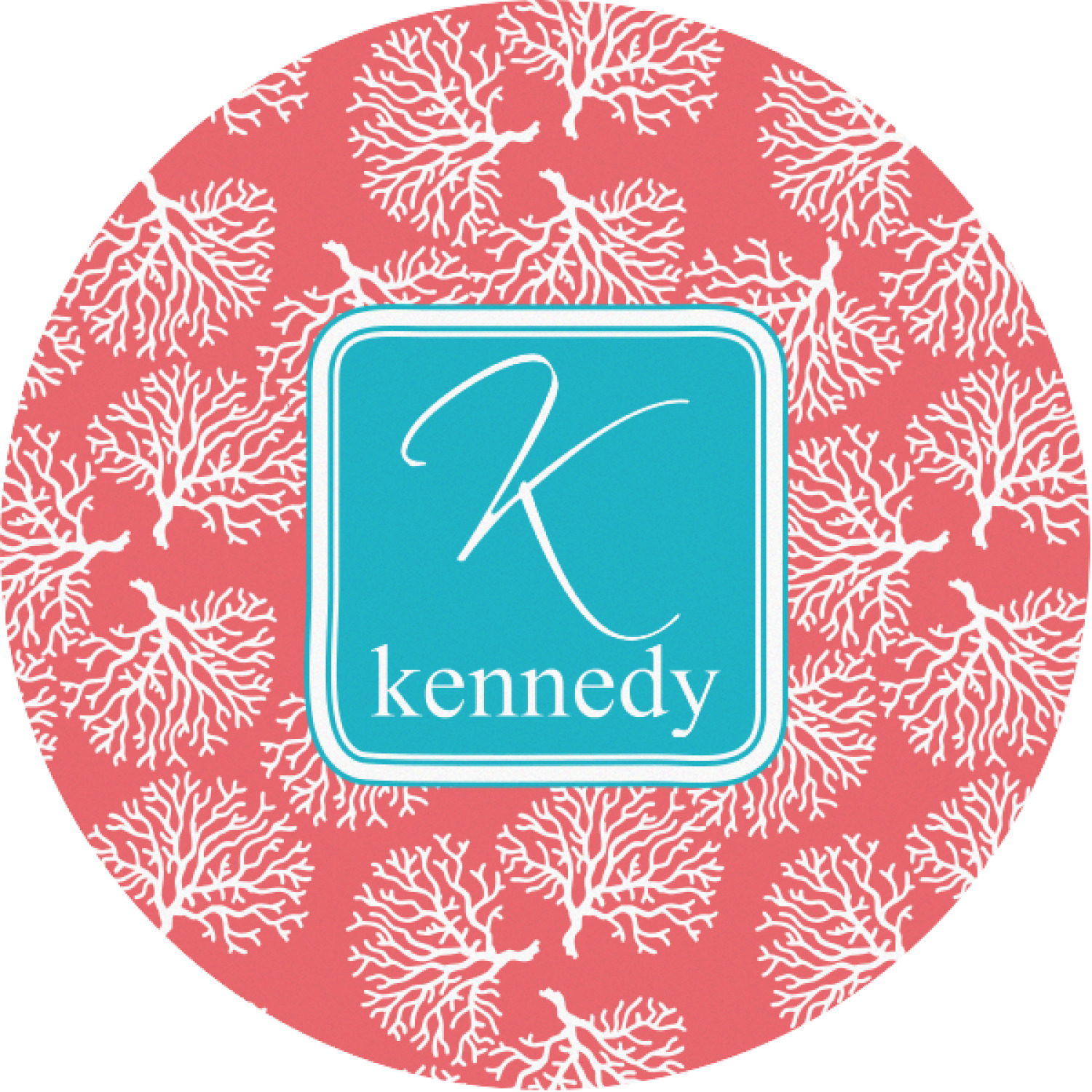 The coral background in this design is absolutely beautiful. The square label highlights the personalization of an initial and name of your choice in the stunning teal blue color.