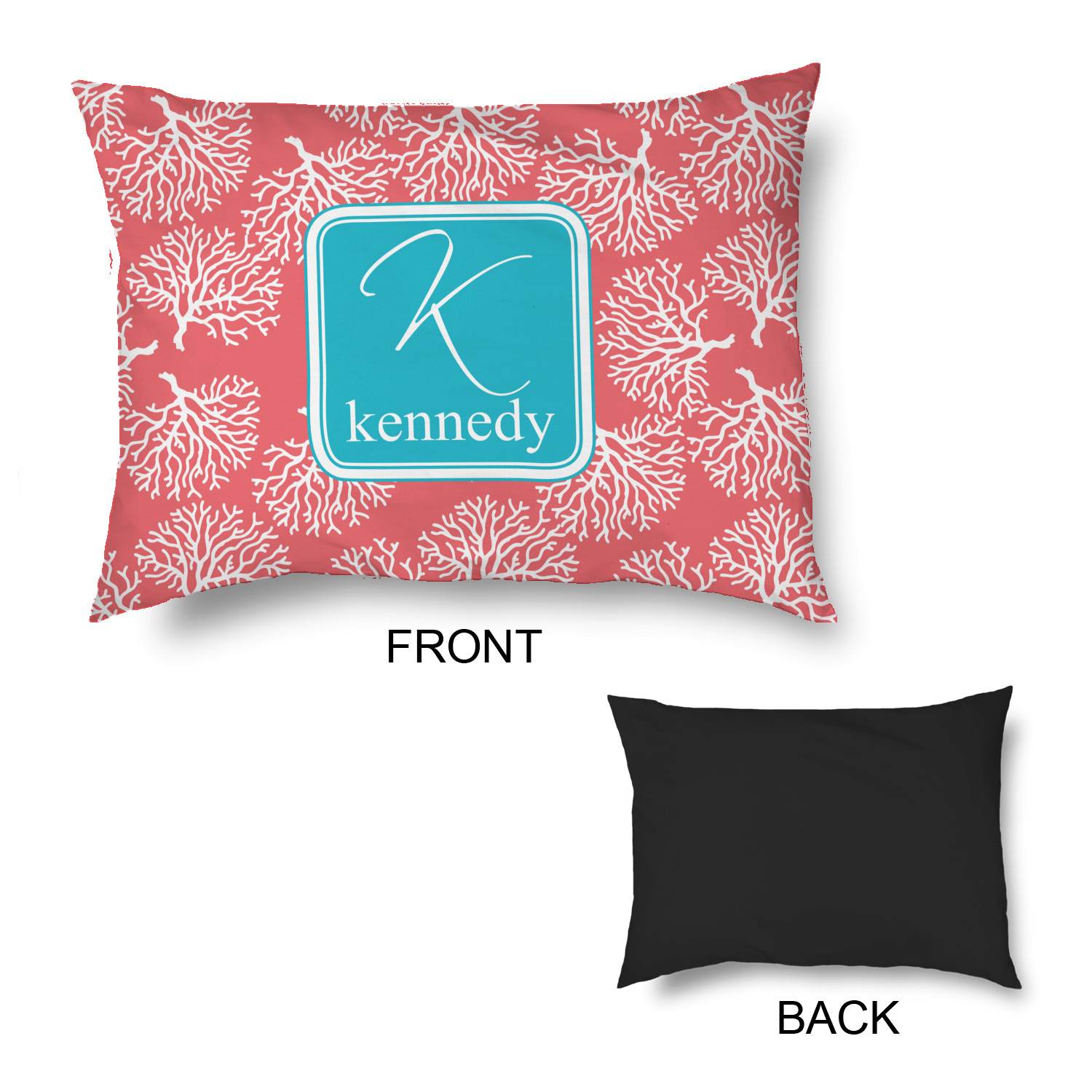 The coral background in this design is absolutely beautiful. The square label highlights the personalization of an initial and name of your choice in the stunning teal blue color.