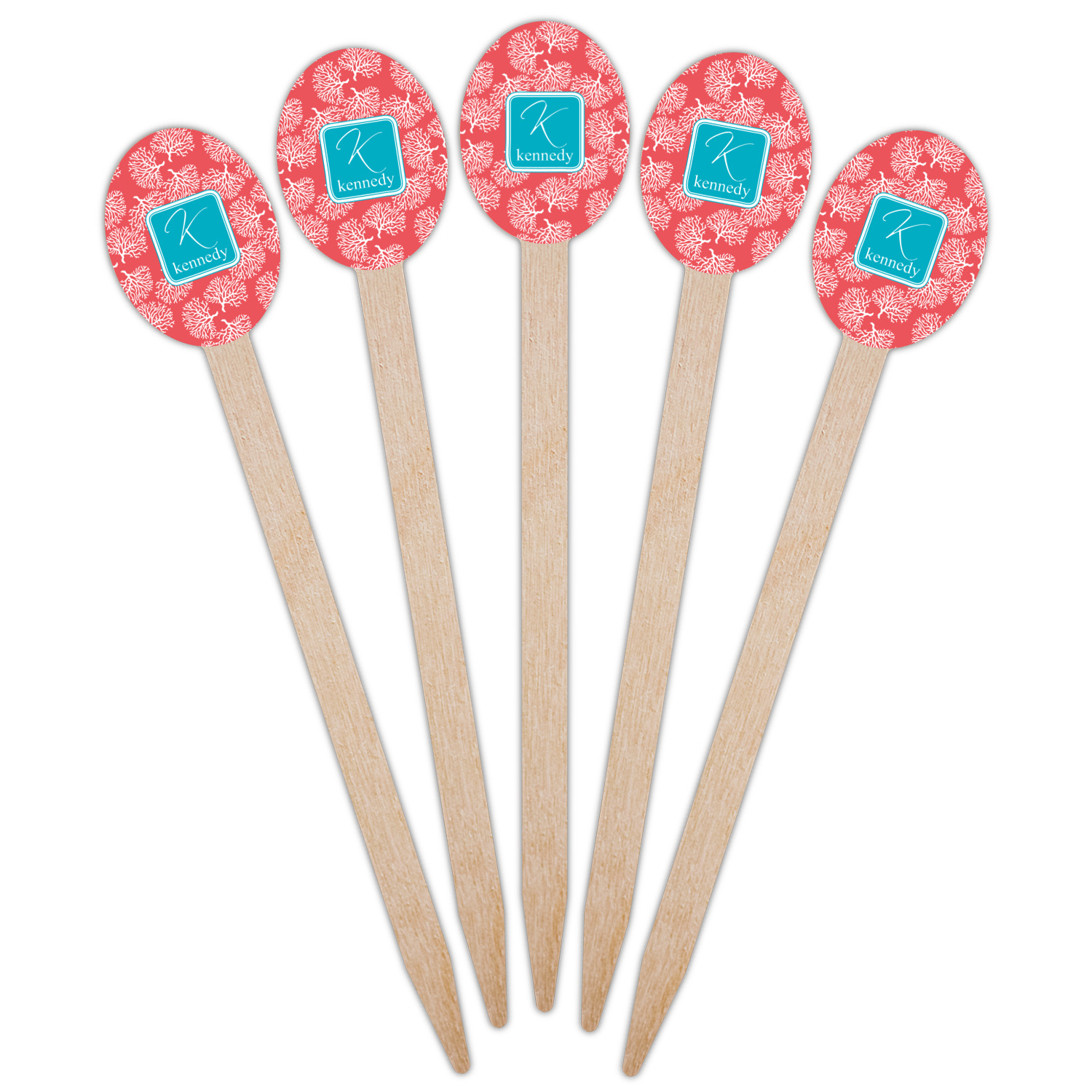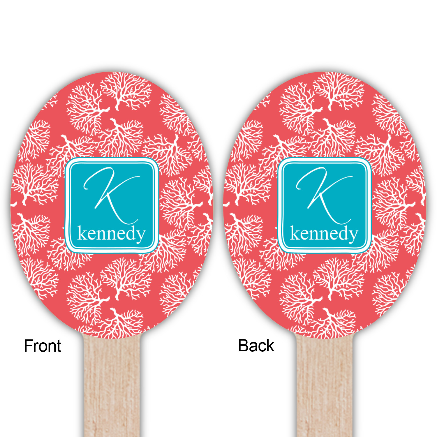 The coral background in this design is absolutely beautiful. The square label highlights the personalization of an initial and name of your choice in the stunning teal blue color.