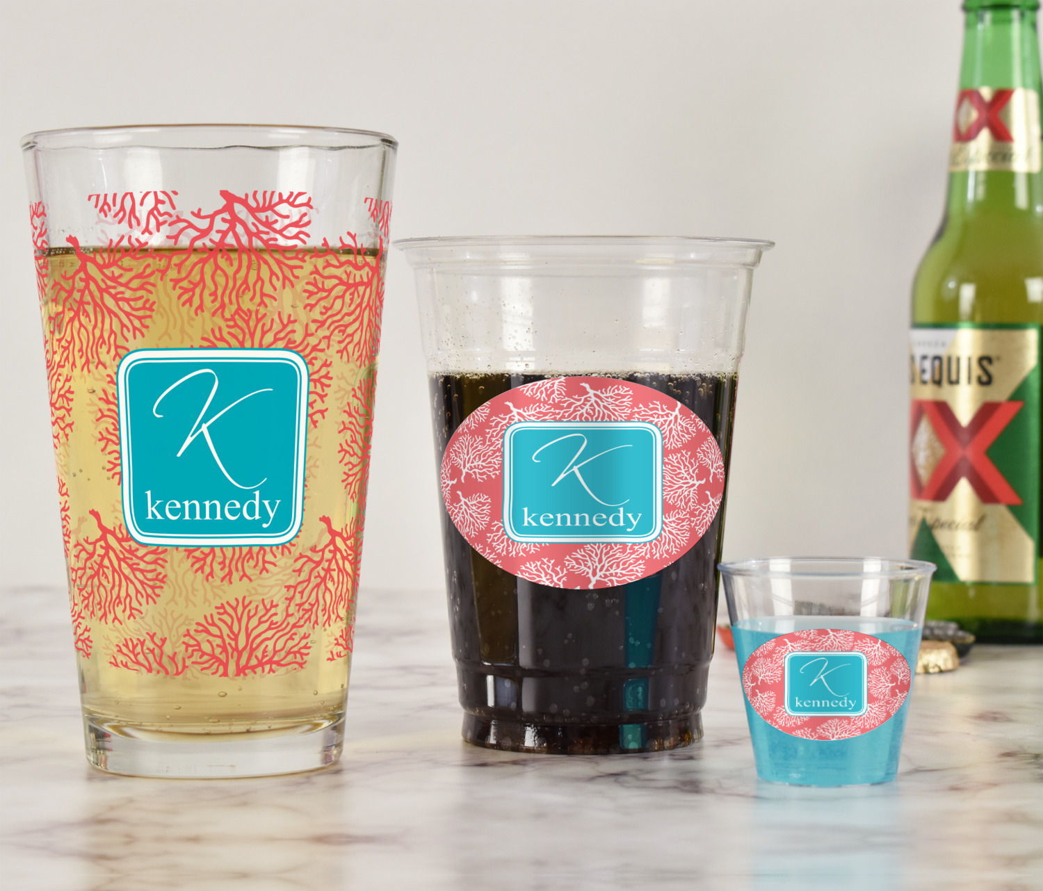 The coral background in this design is absolutely beautiful. The square label highlights the personalization of an initial and name of your choice in the stunning teal blue color.