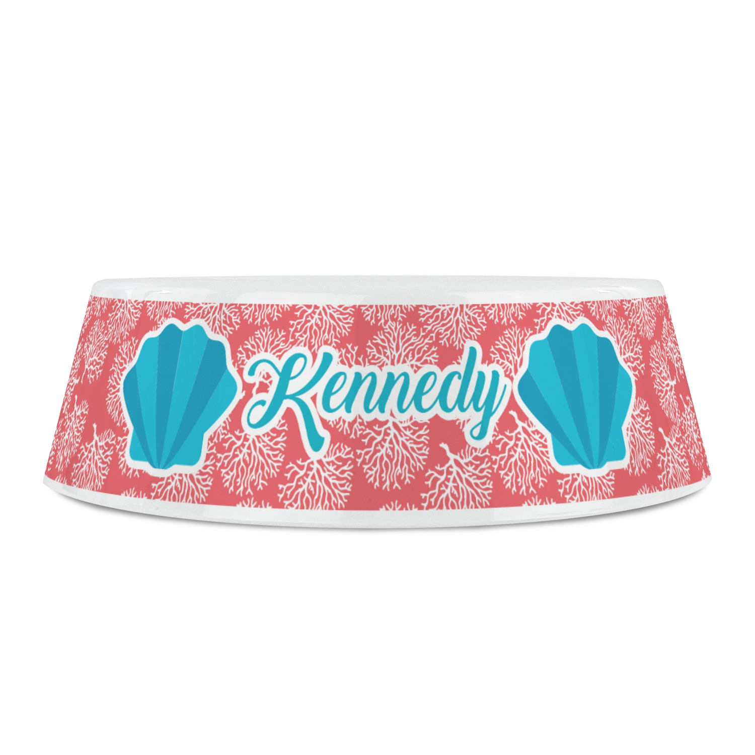 The coral background in this design is absolutely beautiful. The square label highlights the personalization of an initial and name of your choice in the stunning teal blue color.