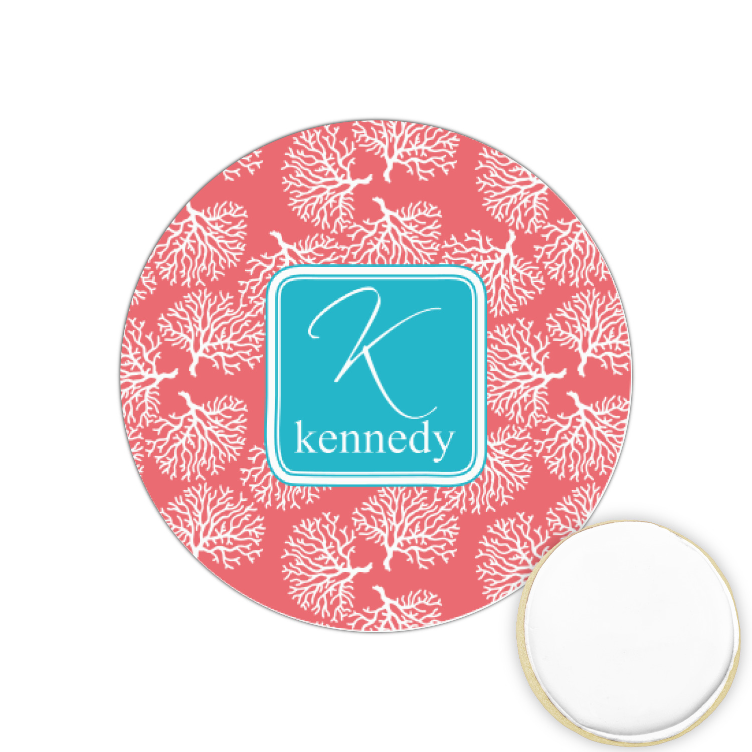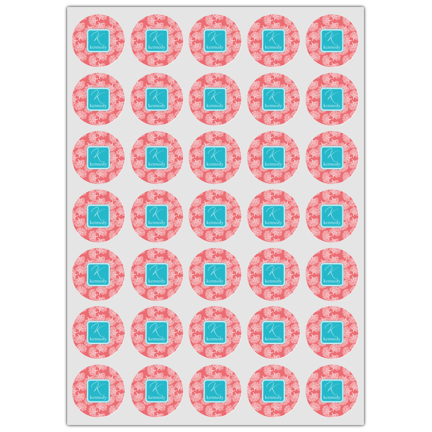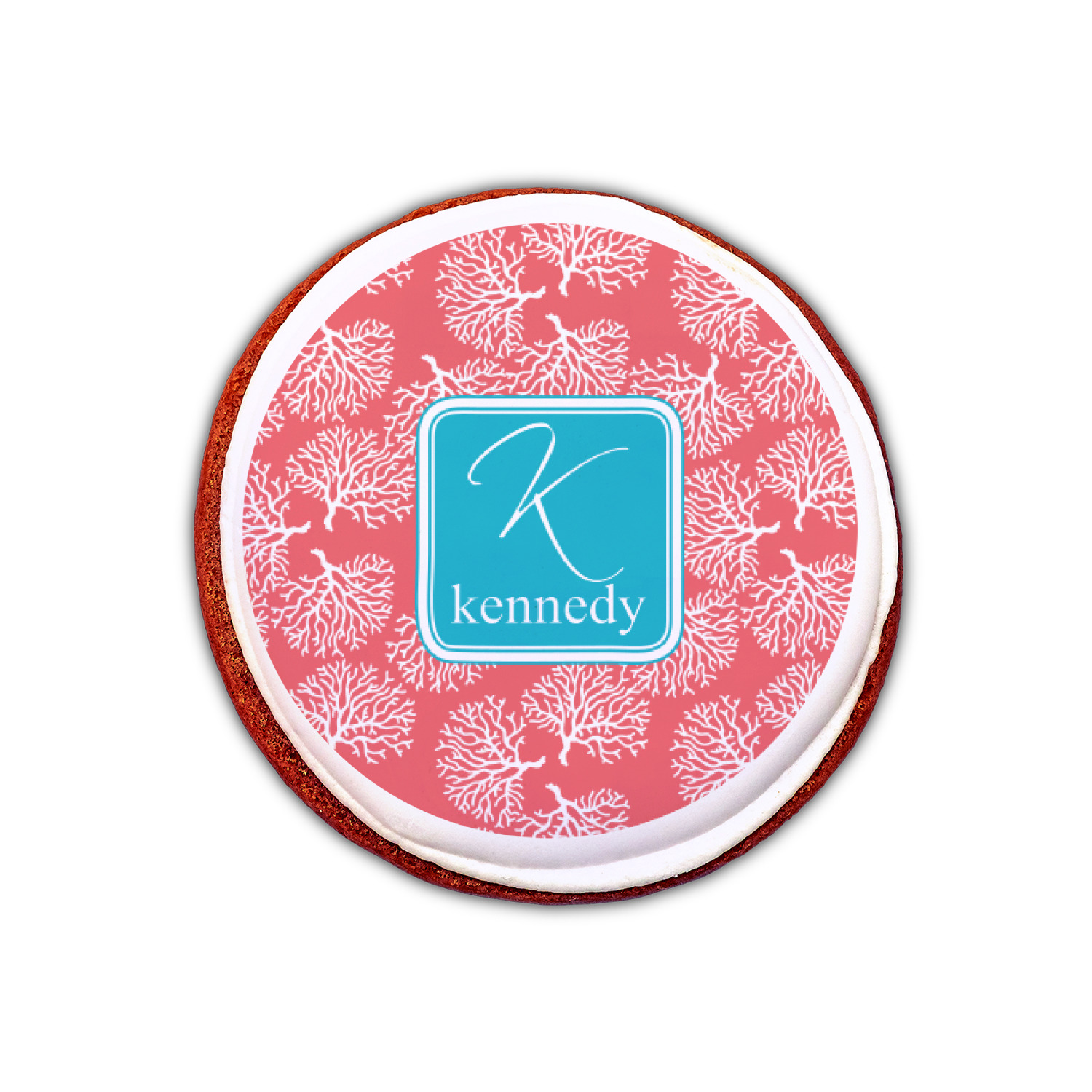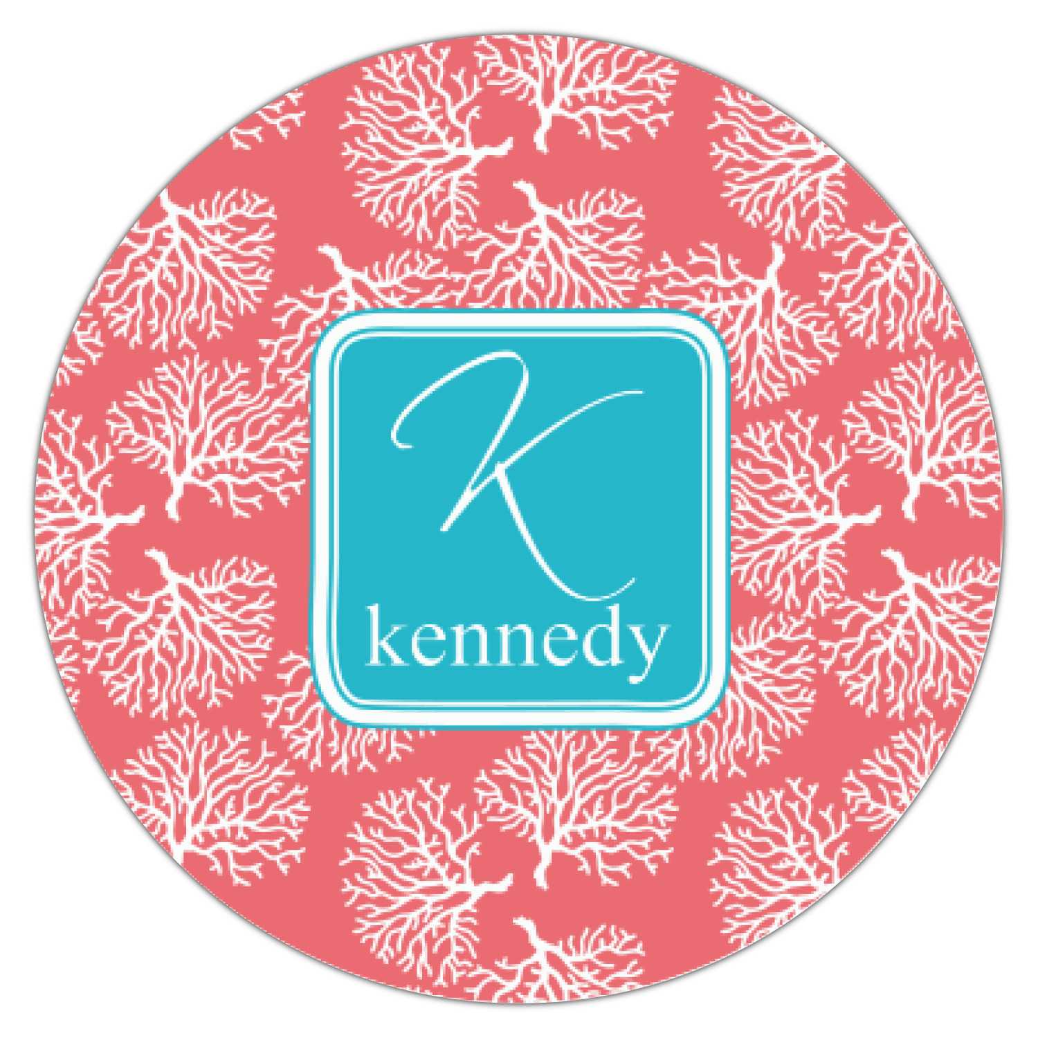 The coral background in this design is absolutely beautiful. The square label highlights the personalization of an initial and name of your choice in the stunning teal blue color.
