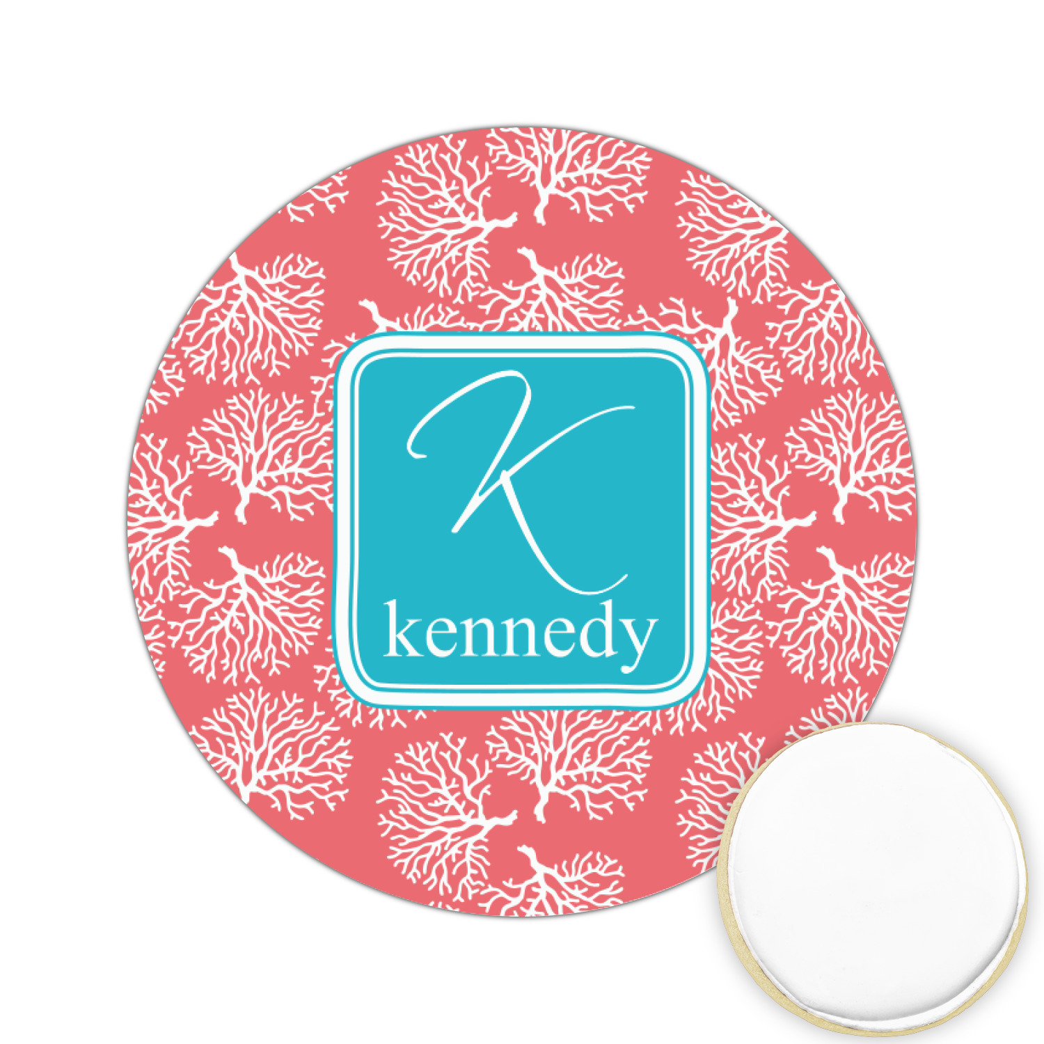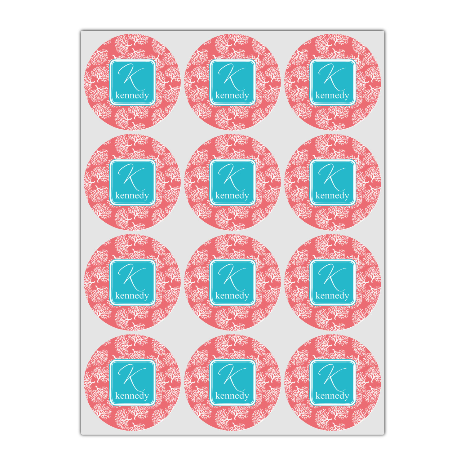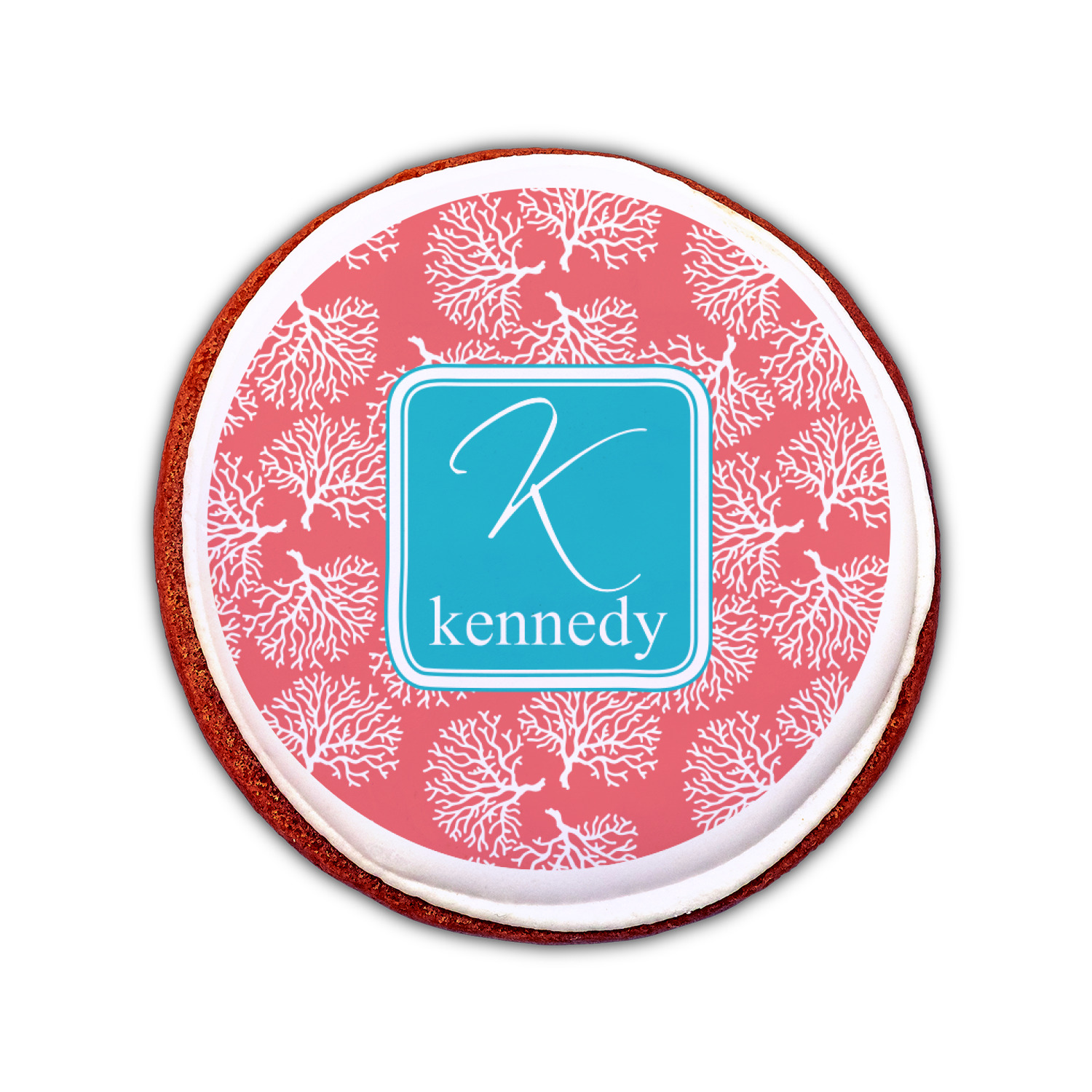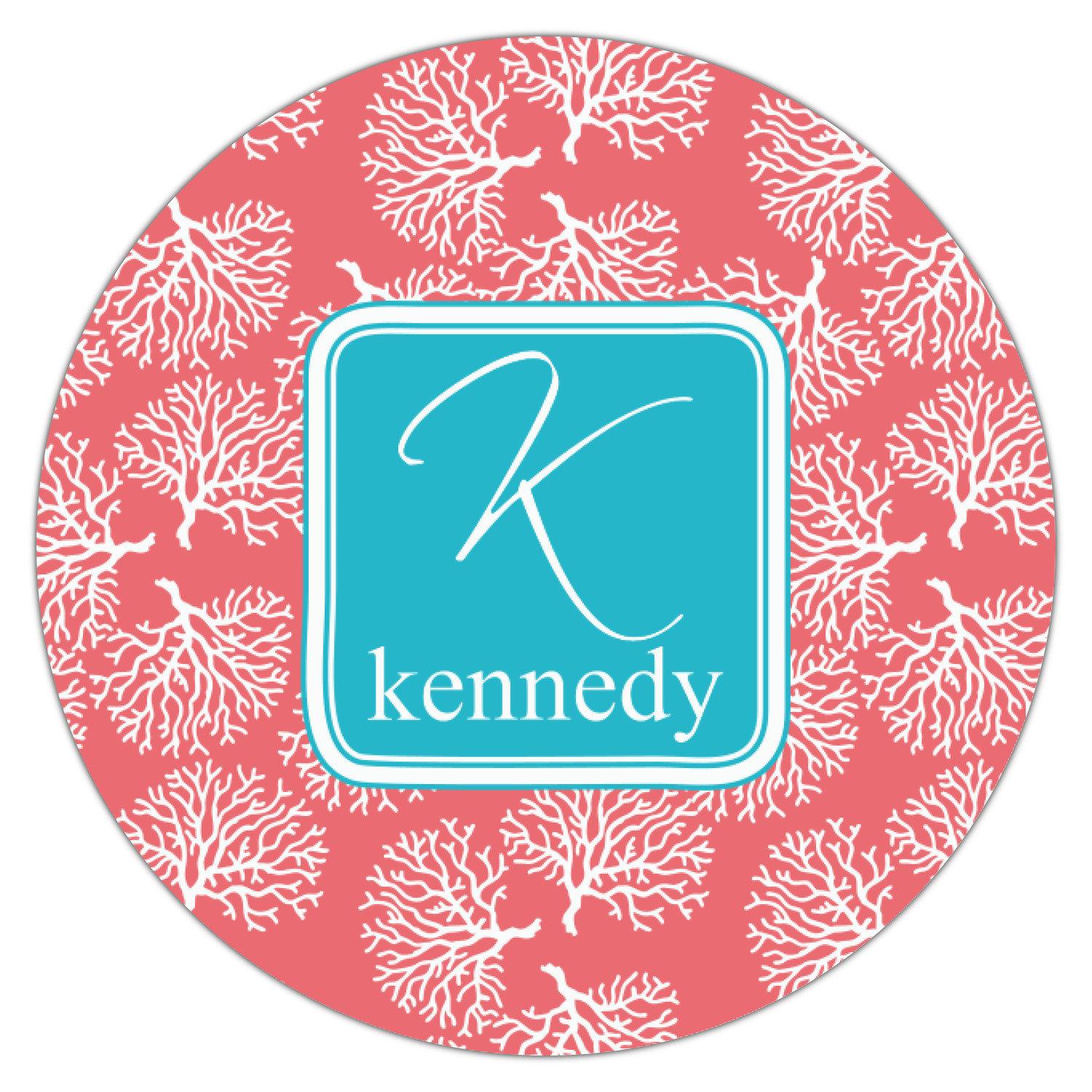 The coral background in this design is absolutely beautiful. The square label highlights the personalization of an initial and name of your choice in the stunning teal blue color.