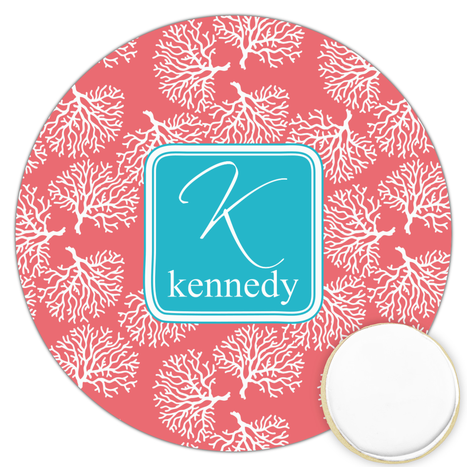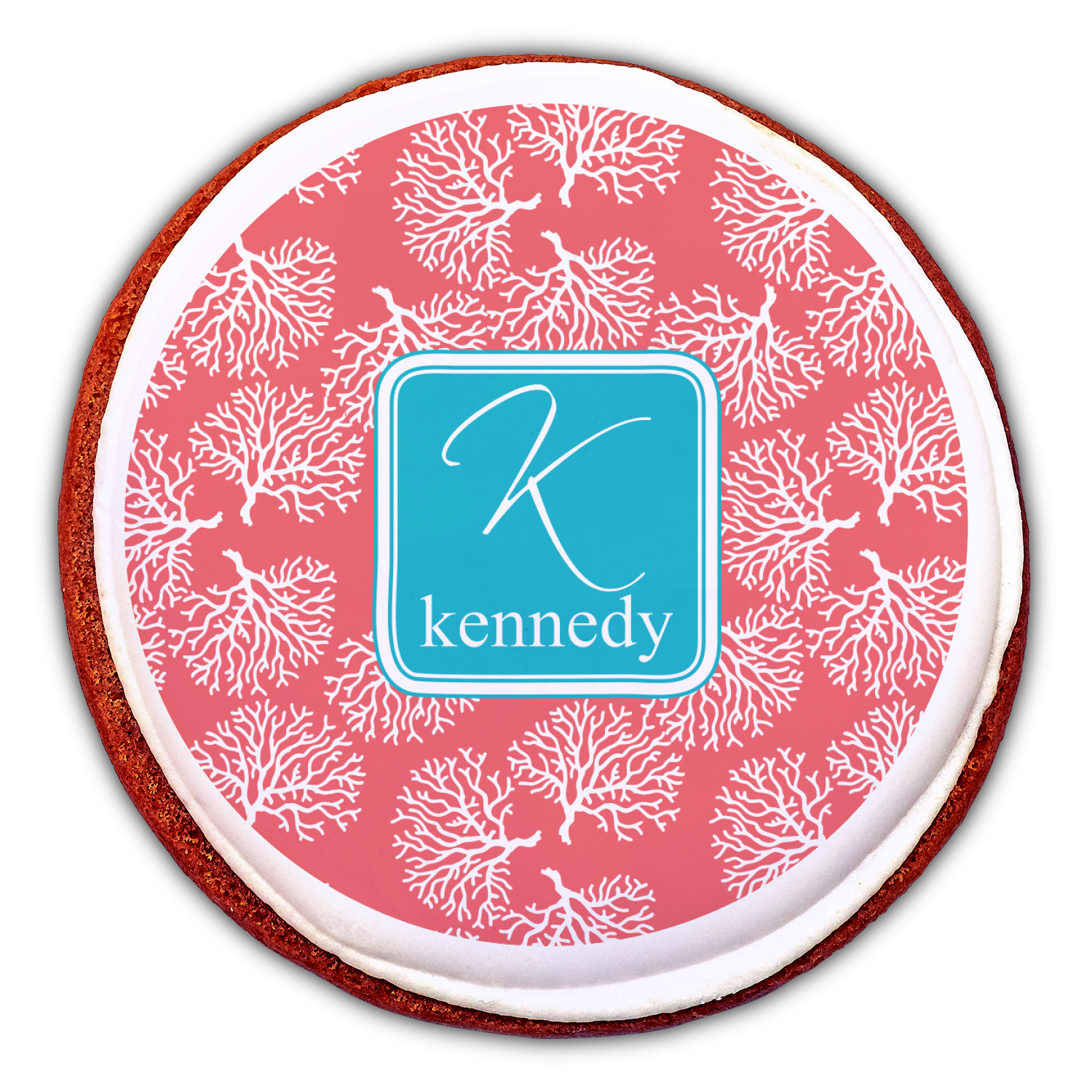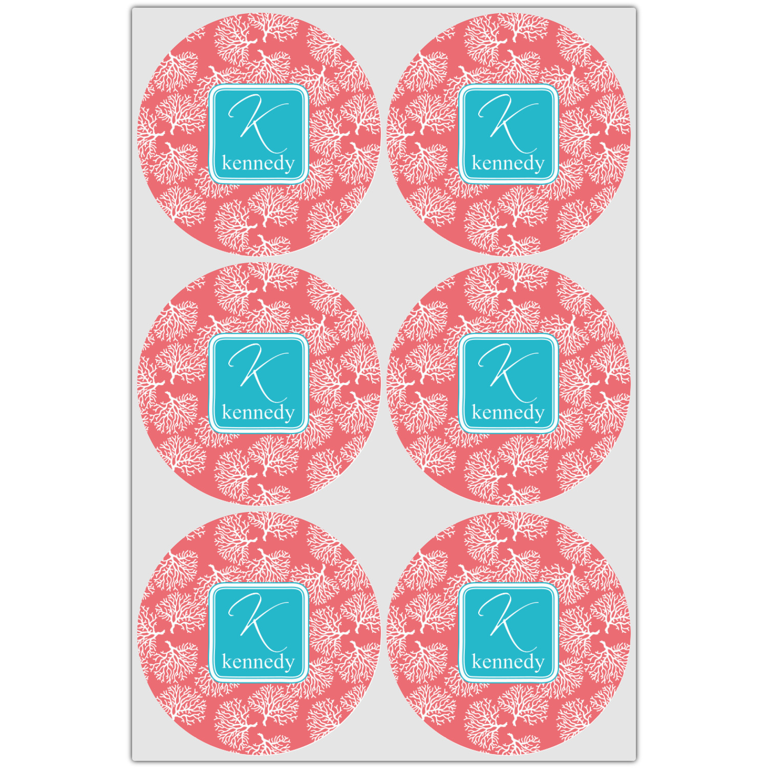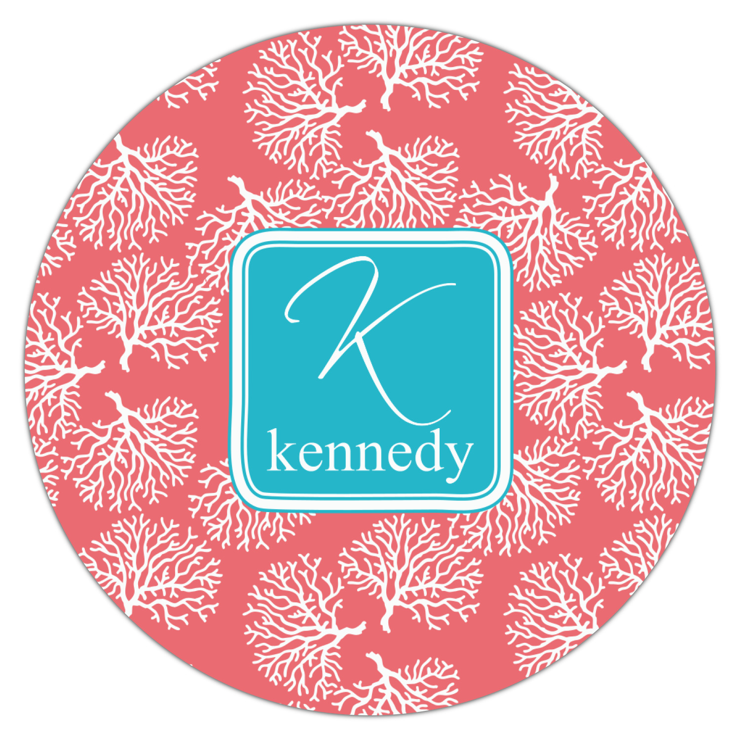The coral background in this design is absolutely beautiful. The square label highlights the personalization of an initial and name of your choice in the stunning teal blue color.