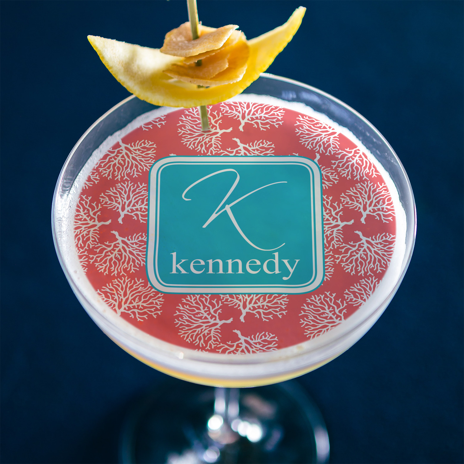 The coral background in this design is absolutely beautiful. The square label highlights the personalization of an initial and name of your choice in the stunning teal blue color.