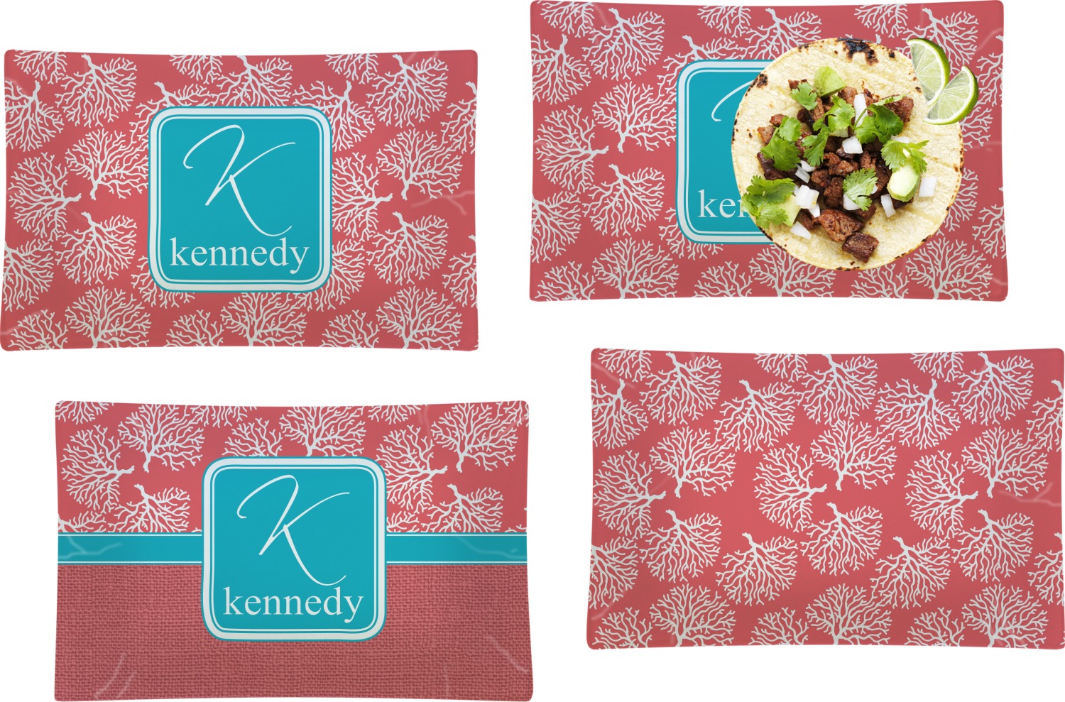 The coral background in this design is absolutely beautiful. The square label highlights the personalization of an initial and name of your choice in the stunning teal blue color.