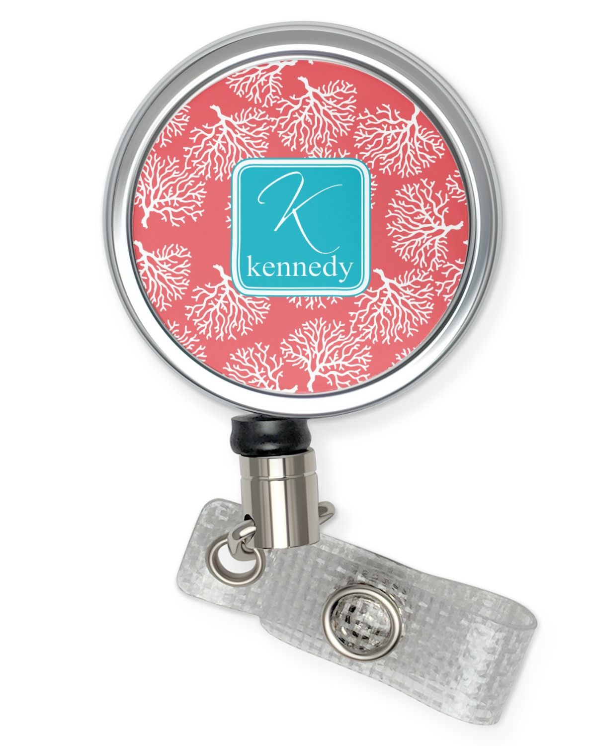 The coral background in this design is absolutely beautiful. The square label highlights the personalization of an initial and name of your choice in the stunning teal blue color.
